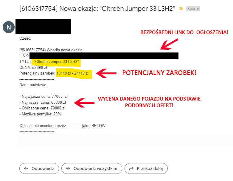 na sprzedaż mam oprogramowanie do monitorowania popularnych platform ogłoszeniowych z ogłoszeniami motoryzacyjnymi. Aplikacja w czasie rzeczywistym monitoruje nowo dodane ogłoszenia, a następnie sprawdza je pod kątem ceny. Jeżeli ogłoszenie jest wycenione poniżej ceny rynkowej, następuje wysyłka powiadomienia.