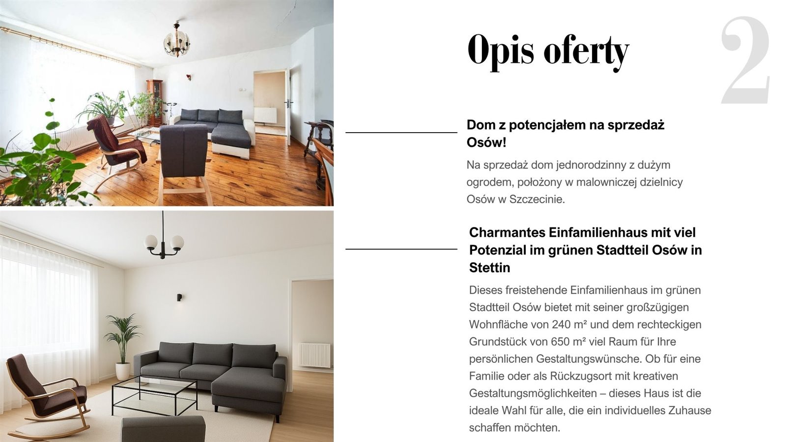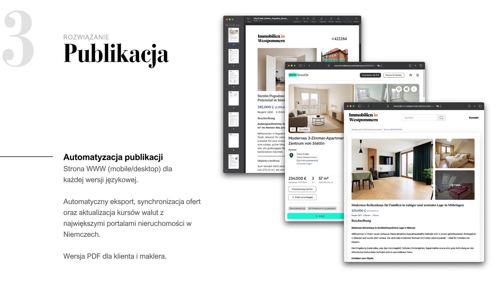 - Publikacja wielokanałowa — własna strona www (Flask, SQLite, wielojęzyczna) oraz integracja z ImmoScout24 (API) i Immowelt (FTP). Architektura umożliwia dodanie kolejnych portali.