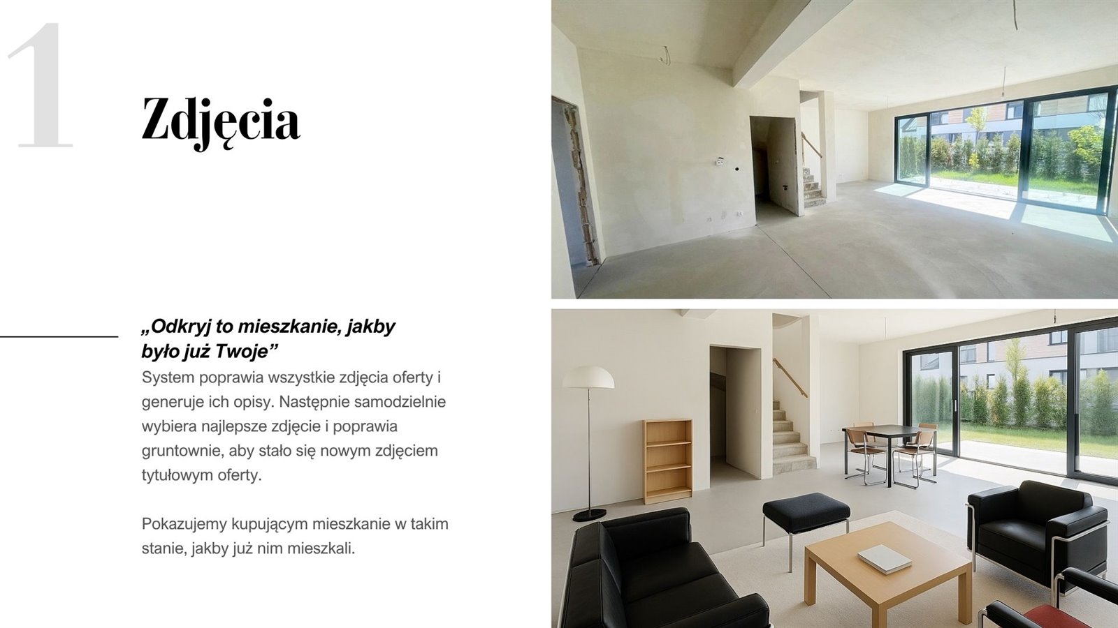 Rdzeń produktu to konwersja oferty nieruchomości z postaci „jak wygląda teraz" do postaci „jak będzie wyglądała po zakupie" — gotowej do sprzedaży na każdym rynku i w każdym języku.