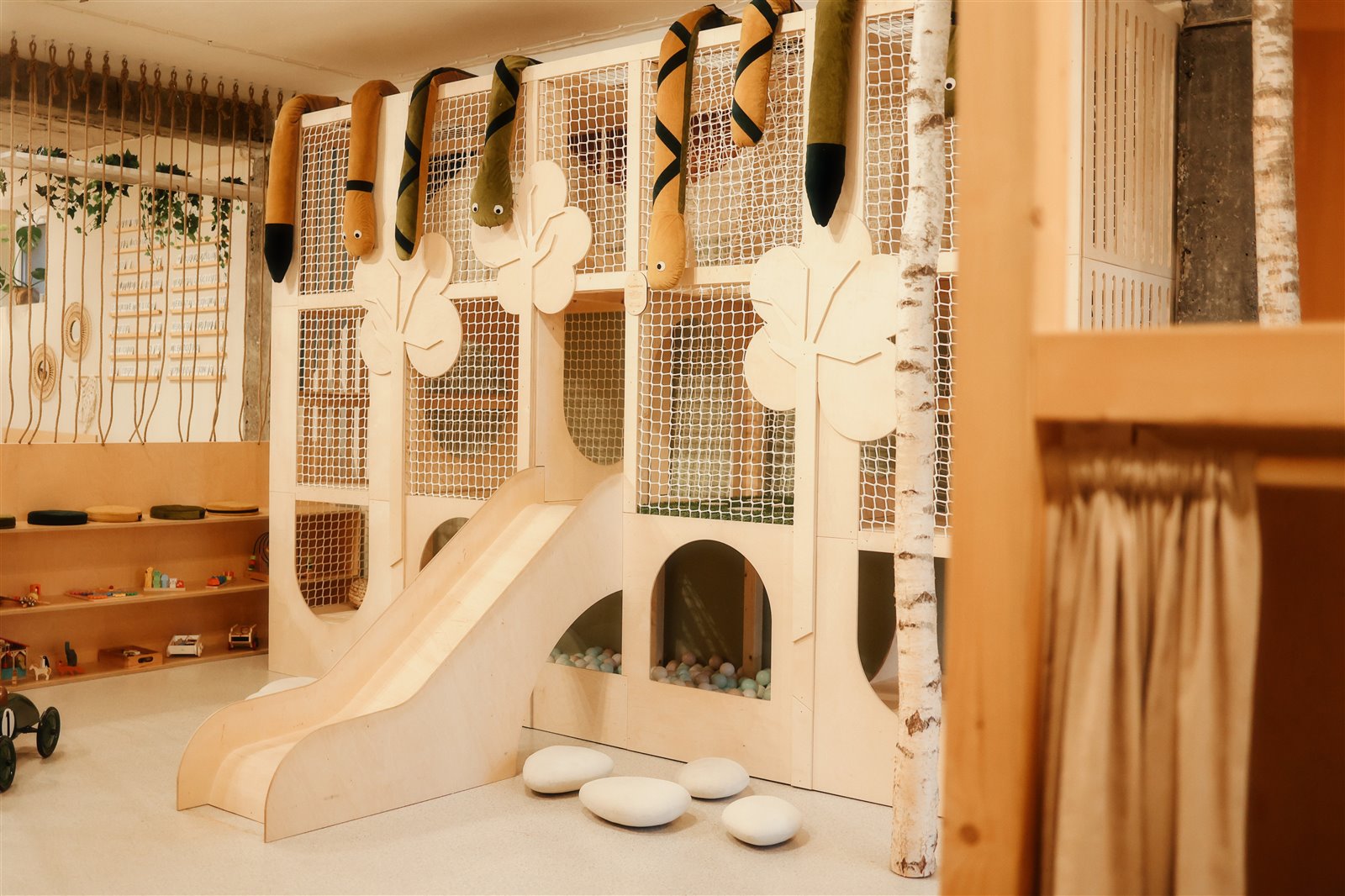 • drewniany, trójpoziomowy małpi gaj ze zjeżdżalnią i basenem z kulkami,