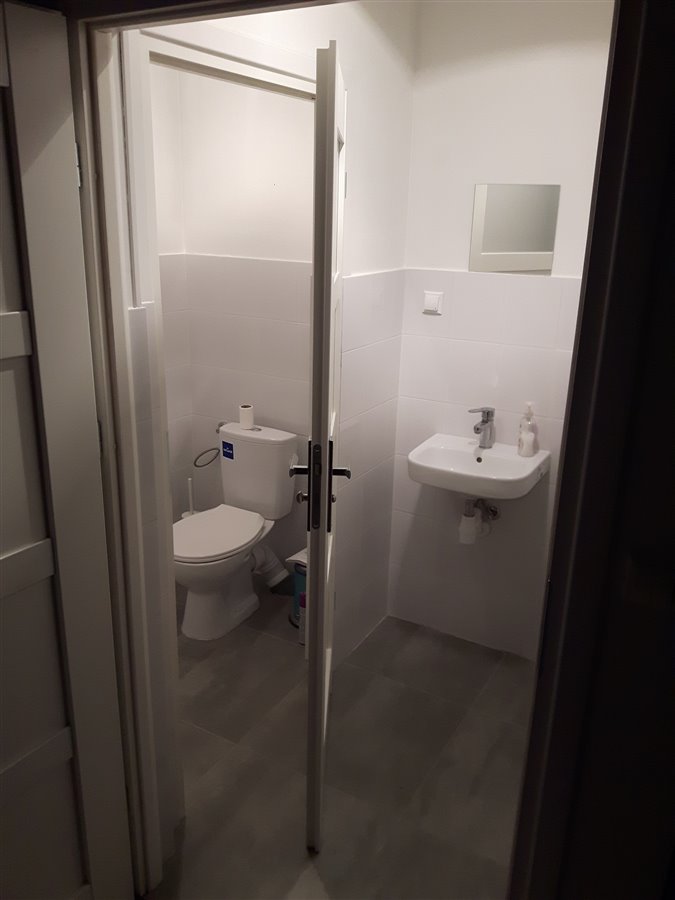 Na zapleczu znajduje się wykończona toaleta z lustrem, umywalką, grzejnikiem i pomieszczeniem WC.