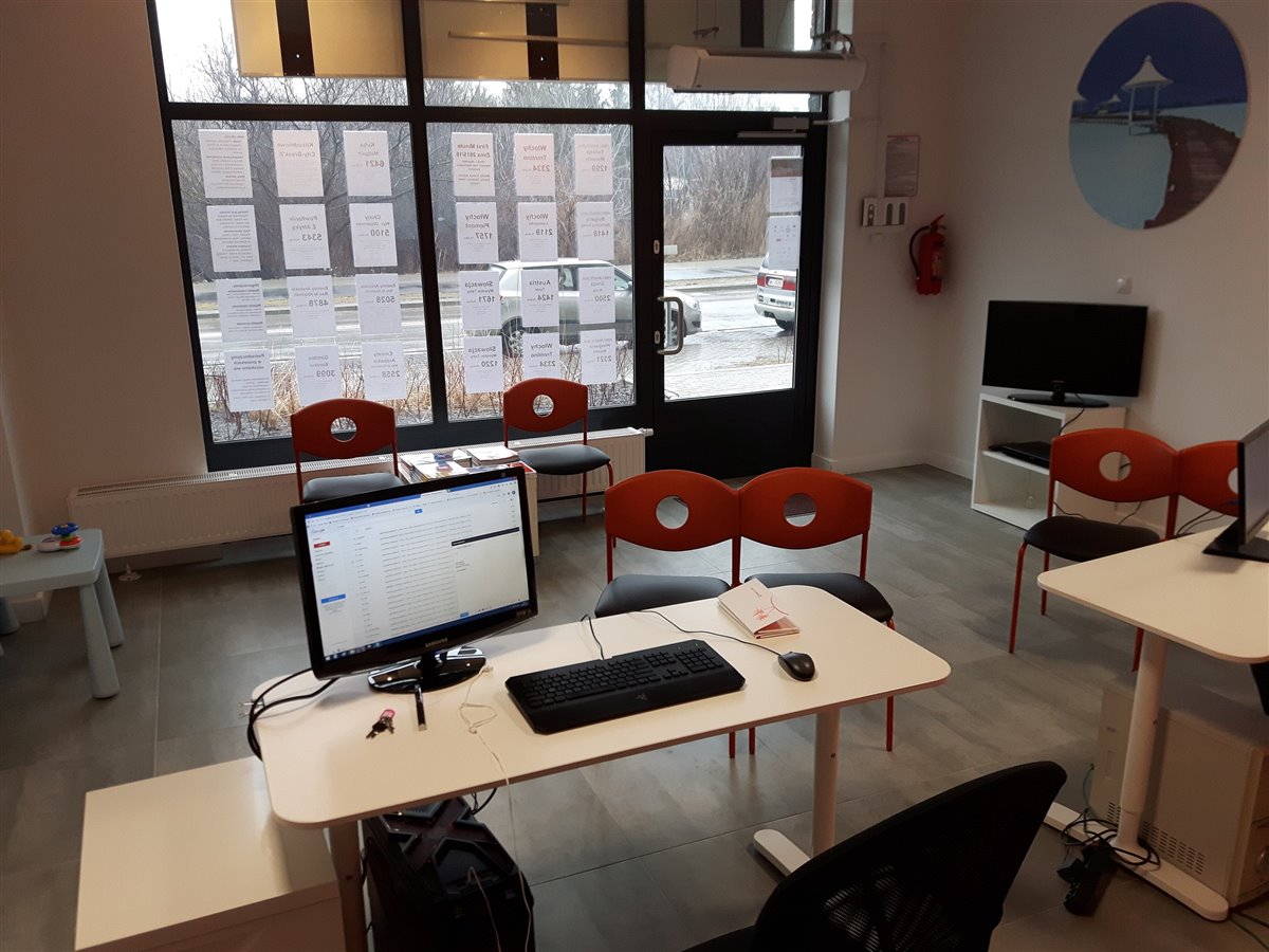 Biuro wyposażone jest w 2 stanowiska obsługi klienta na sali sprzedaży o wielkości 30 m2, w lokalu o powierzchni 80 m2. Lokal posiada duże zaplecze, które służy nam jako magazyn. Obiekt zlokalizowany jest na parterze, bezpośrednio przy ulicy oraz posiada witrynę reklamową w postaci 2 oszklonych okien oraz szklane drzwi z samozamykaczem i kurtyną powietrzną.