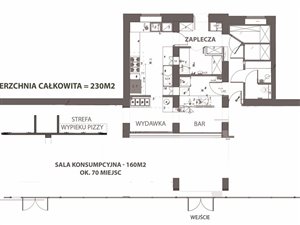 Na wyposażeniu cały niezbędny sprzęt dla przygotowywania pizzy i innych rodzajów dań, oraz obsługi klienta. Sala umeblowana, stoły i miękkie krzesła, dodatkowe łoże.