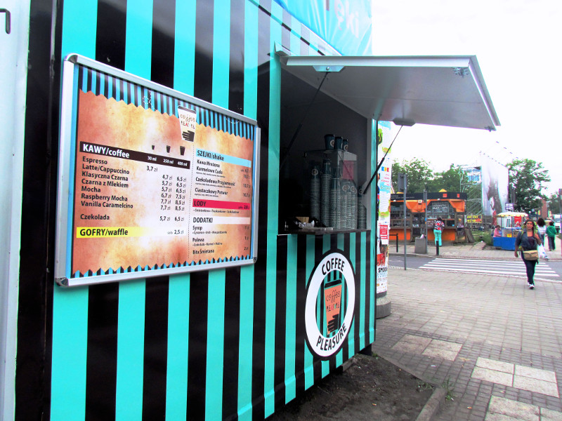 >indywidualna grafika firmowa, projekt oklejenia budki, projekt kubków, kart stałego klienta, cennika, ulotek, wizytówek