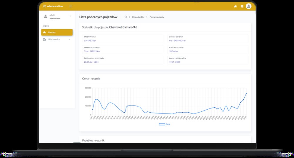 "Vehicleanalizer uruchamia się cyklicznie pobierając informacje o wcześniej zaplanowanych samochodach. Następnie dane pojazdy możemy analizować ze względu na sześć rożnych kategorii wykresów oraz informacji statystycznych. Każdy pojazd na portalach ogłoszeniowych ma swoją historię cenową dzięki czemu możemy śledzić czy dane ogłoszenie było edytowane."