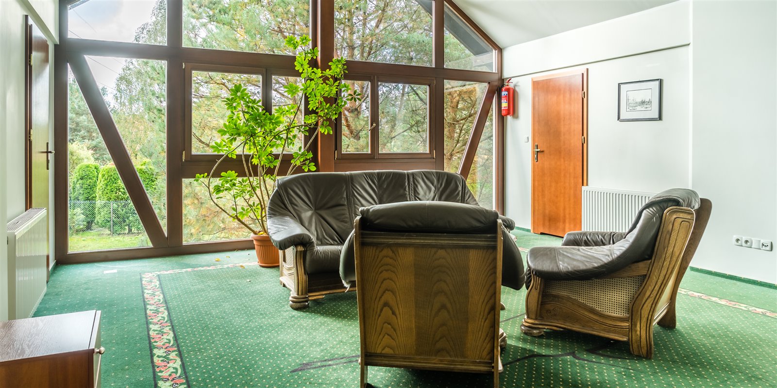 - Główny budynek posiada 9 pokoi hotelowych, recepcję, restaurację, bar, zaplecze kuchenne, prywatne mieszkanie wraz z biurem dla Właściciela obiektu, pokój zabaw dla dzieci, salę fitness oraz saunę - niezwykle cenioną w jesienne i zimowe wieczory.