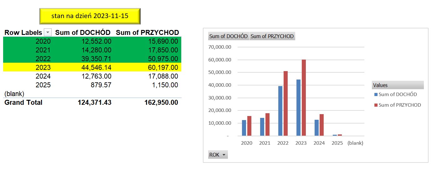 W mojej konfiguracji przychody fotolustra w 2022 wyniosły ponad 50 tys, w 2023 prognozujemy 65 tys. przychodu, a nie jest to jeszcze pełnia możliwości. Koszty prowadzenia działalności to około 22 -25% przychodu.