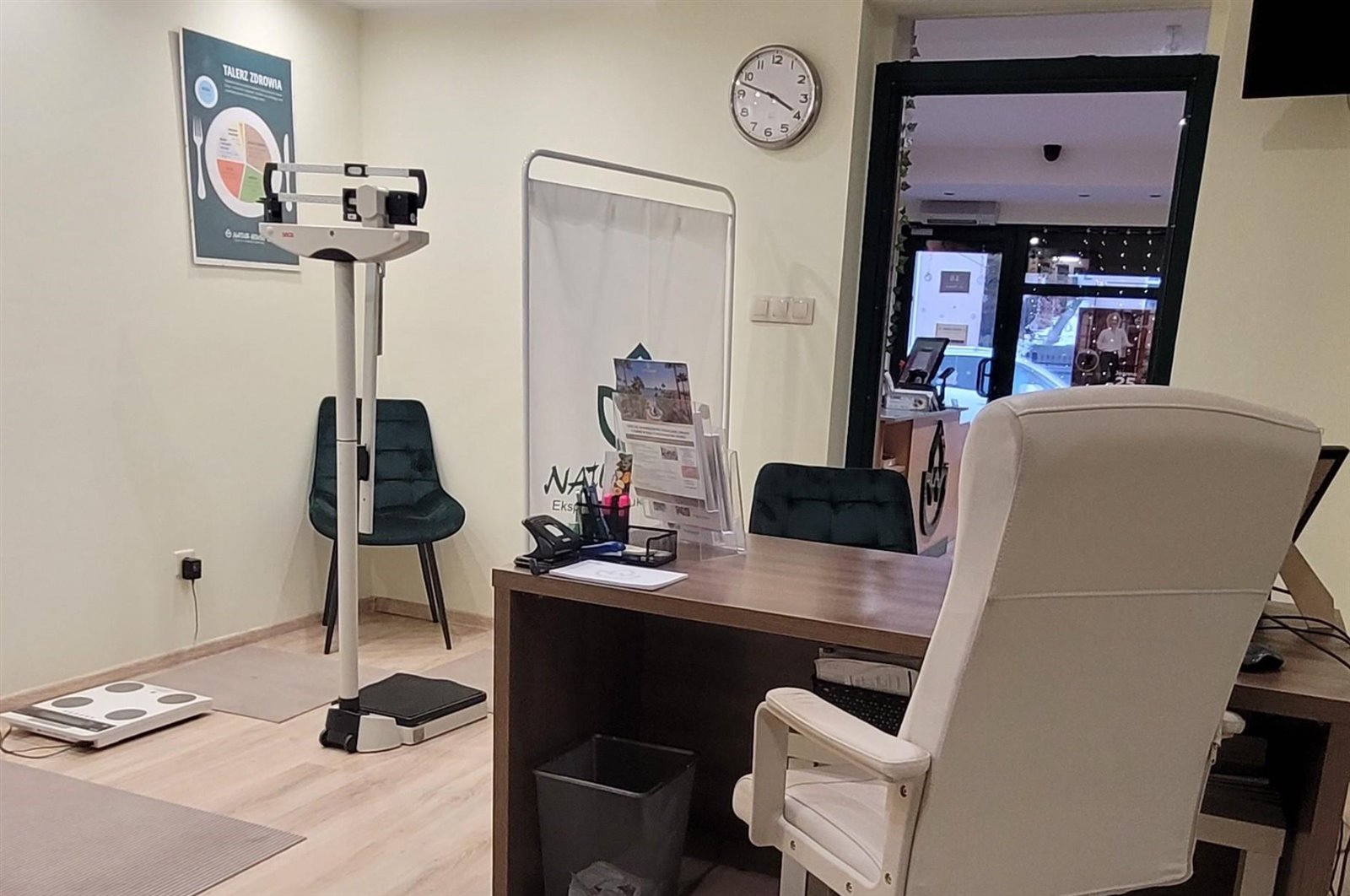 W pełni wyposażona sala sprzedaży, gabinet dietetyka oraz zaplecze. Lokal wyposażony jest w potrzebne meble, wagi i komputery.