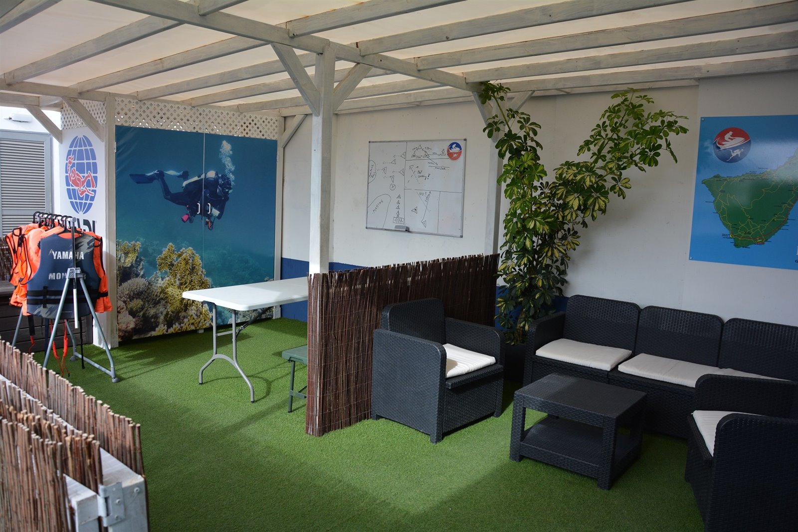 • Składa się z pomieszczeń zamkniętych (biuro i pomieszczenie do przechowywania sprzętu z kompresownią) oraz zadaszonych otwartych (miejsce rekreacyjne i szkoleniowe).