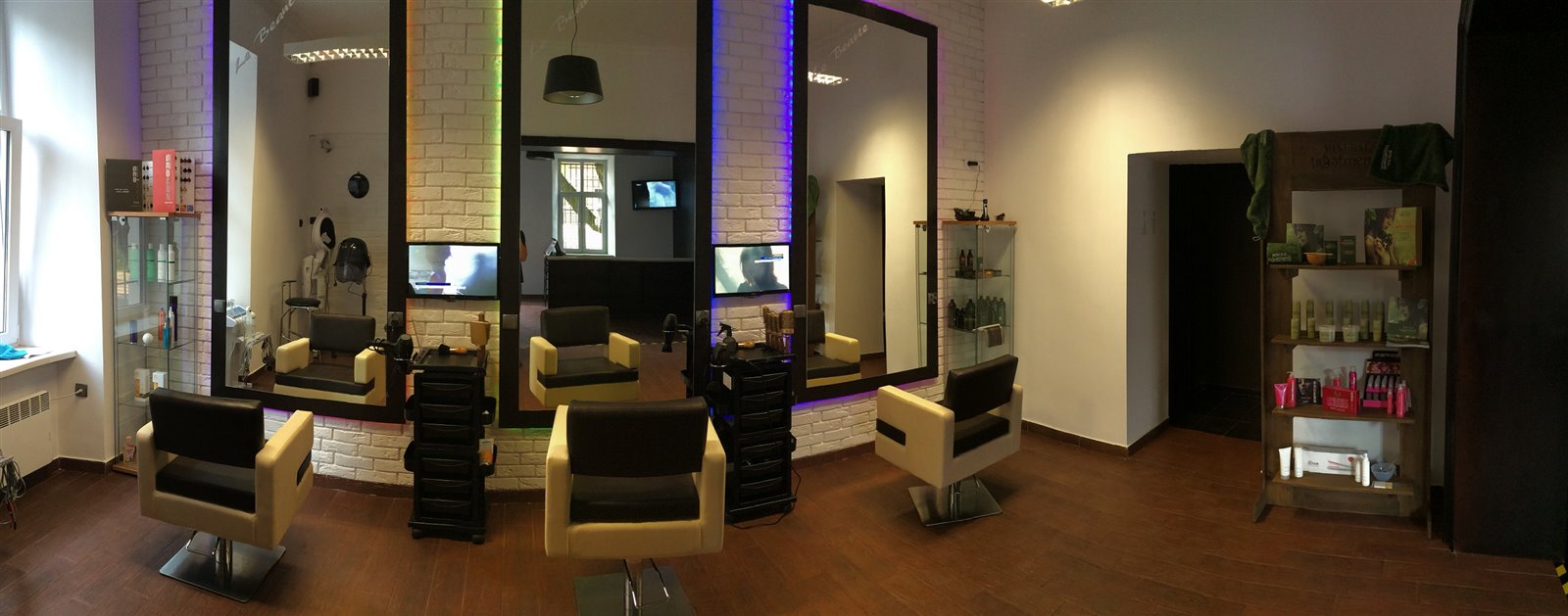 -Trzy duże stanowiska Fryzjerskie (Lustra 100x200cm) wraz z dwoma TV LG-Led.