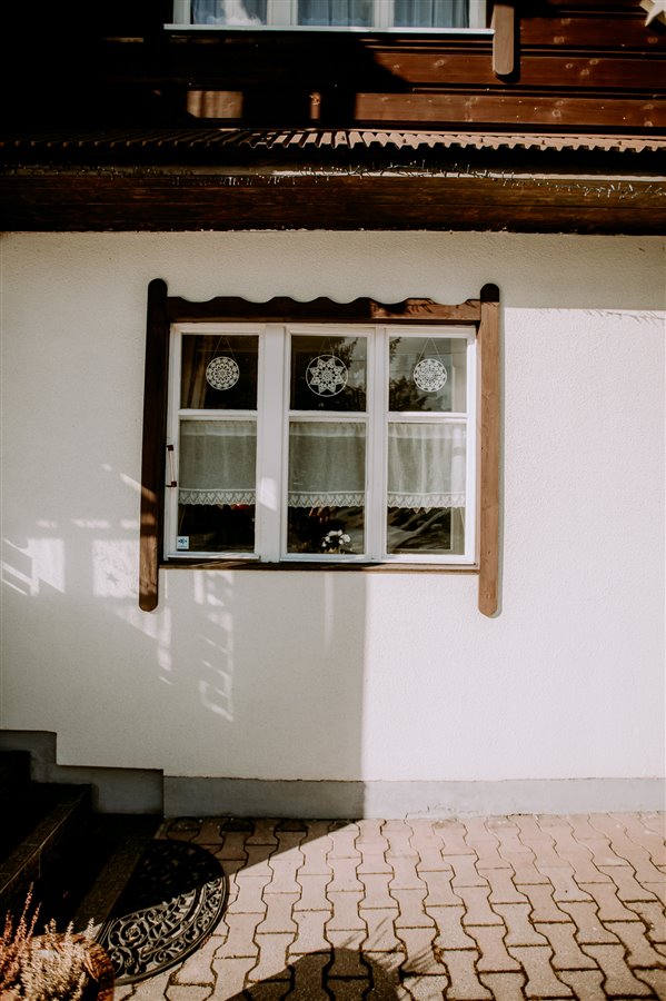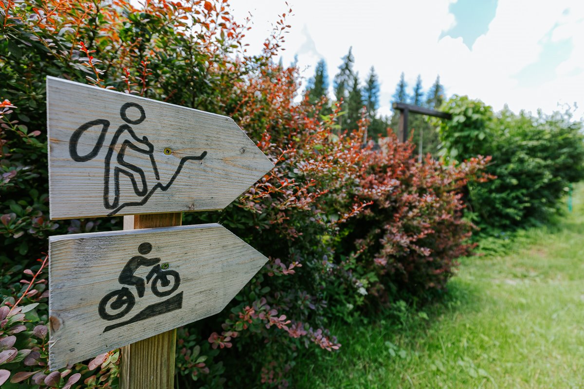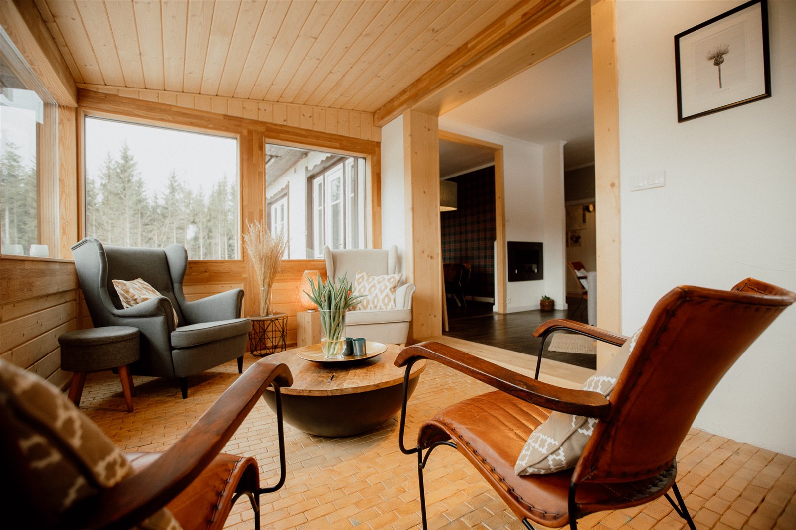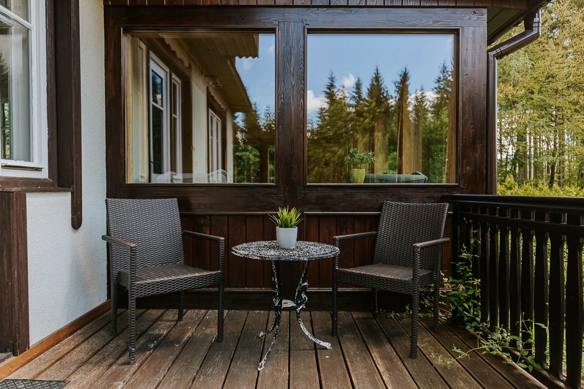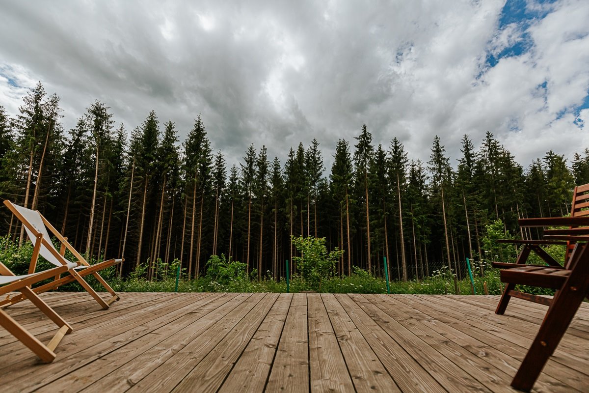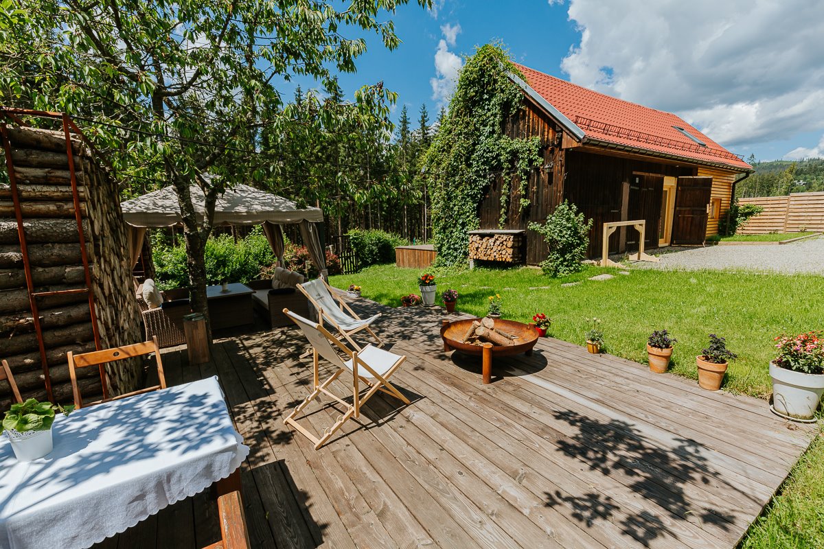 Z tyłu nieruchomości, od strony lasu znajduje się ogród z tarasami, meblami wypoczynkowymi, leżakami, miejscem na ognisko i grilla. Nieruchomość posiada bezpośrednie wejście do lasu, skąd można wyruszyć na szlaki.
