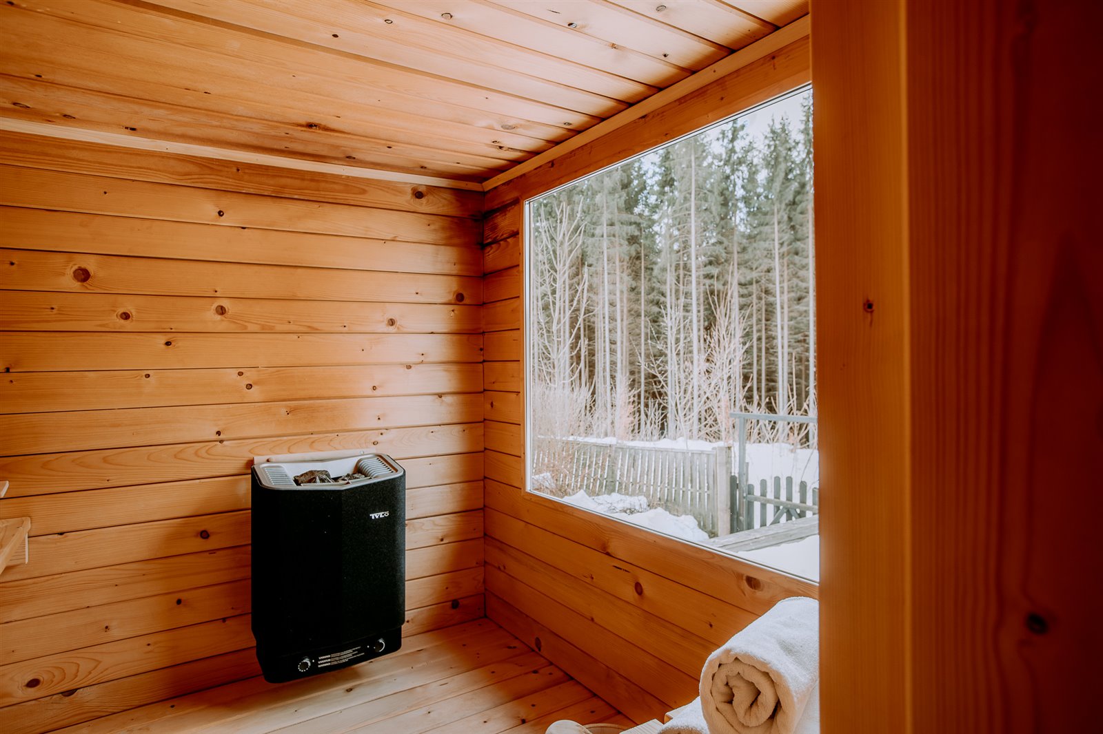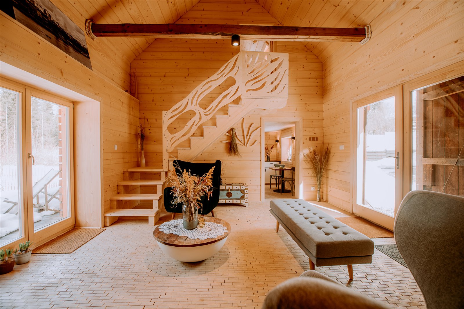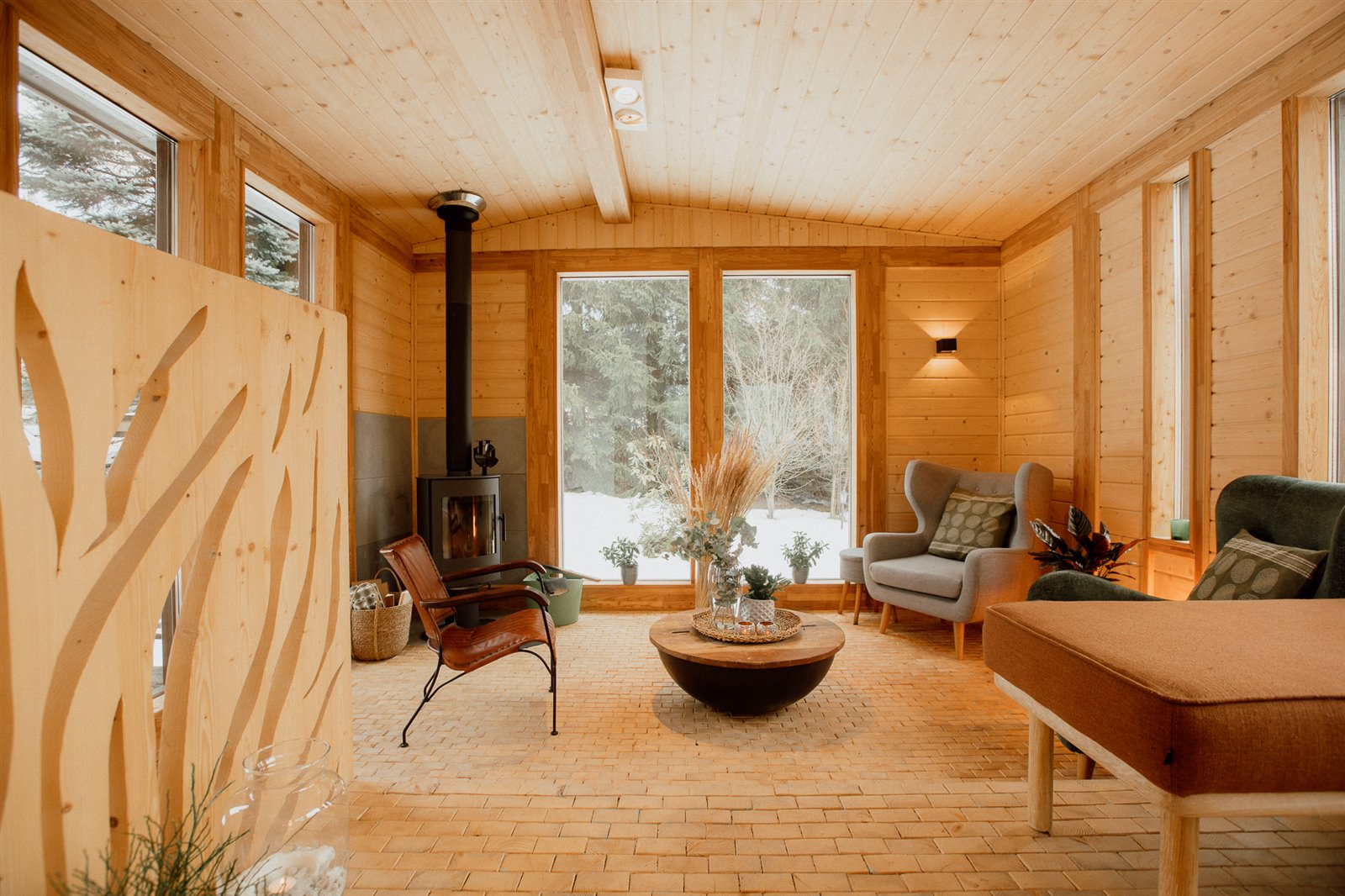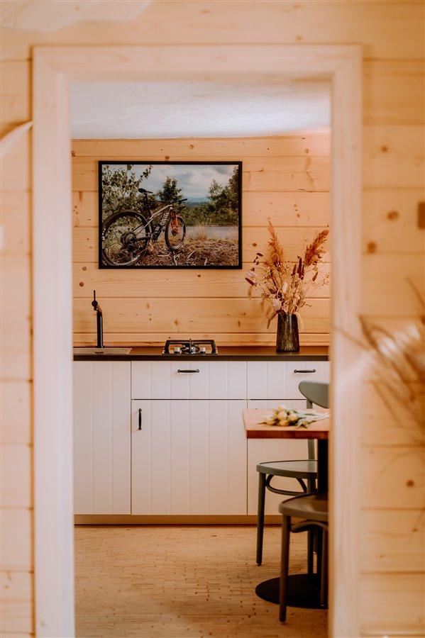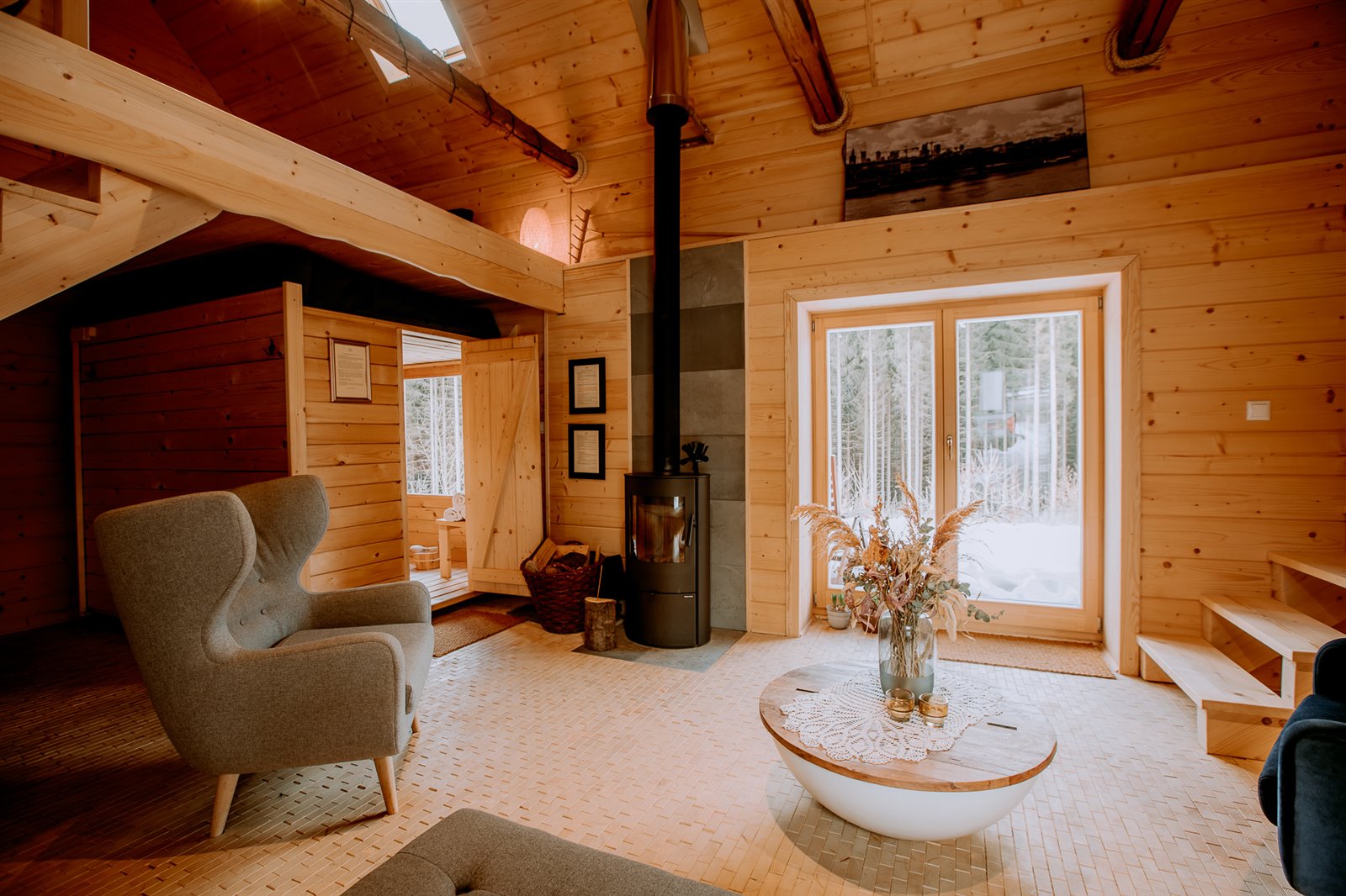 W budynku rekreacyjnym poza sauną znajduje się salon z kominkiem, kuchnia, łazienka oraz 2 sypialnie, z czego jedna otwarta na antresoli.