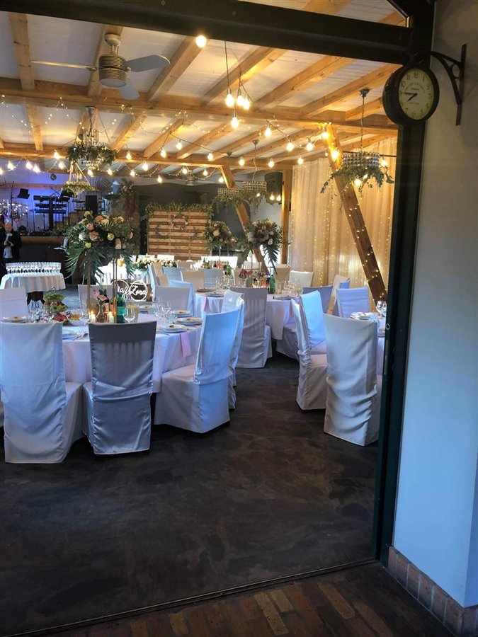 Pierwszy z budynków to elegancki dom weselny, który idealnie nadaje się do organizacji przyjęć i innych eventów. Jego powierzchnia wynosi 415 m², z czego: