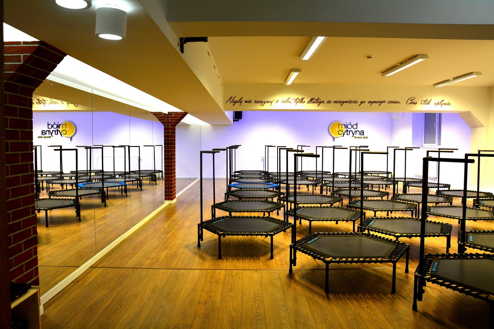Klub mieści się w lokalu wielkości około 90m2. Znajdują się w nim mała recepcja, szatnia (z 40 szafkami oraz pufami) z prysznicem i toaletą oraz sala ćwiczeń. Sala wyposażona jest w sprzęt fitness: 19 trampolin, 14 sztang z obciążeniem, 14 mat, nagłośnienie z mikrofonem nagłownym, klimatyzacja.