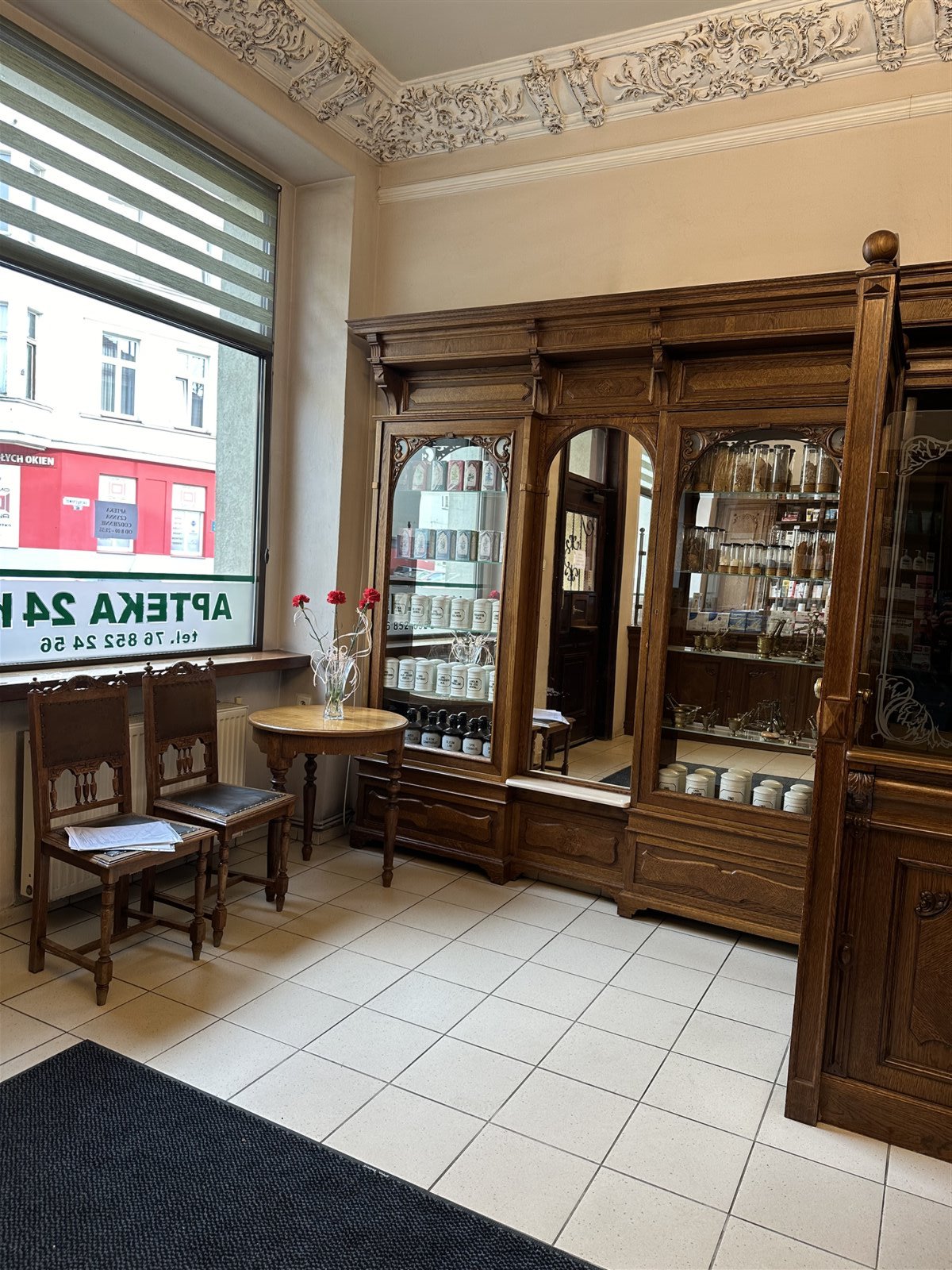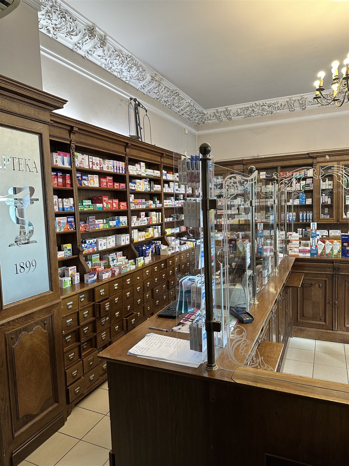 Apteka posiada dwa stanowiska kasowe a oryginalne, zabytkowe drewniane meble podkreślają jej niezwykły, przesiąknięty ponad 100-letnią historią klimat.