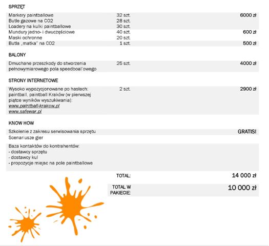 W skrócie: sprzęt sprawny- serwisowany od początku przeze mnie, strony WWW mają swoje lata i graficznie nie zabijają ale są dobrze wypozycjonowane więc wystarczy zmienić nr telefonu na swój i podać adres nowego pola. Do tego kawałek zalesionego terenu albo łąka na której można stworzyć w dwa dni przeszkody z palet i opon albo rozłożyć balony. Biznes do przejęcia i uruchomienia w kilka dni. Fajna opcja na dodatkowy sezonowy zarobek, pierwszą firmę dla młodego człowieka czy jako uzupełnienie posiadanej oferty eventowej.