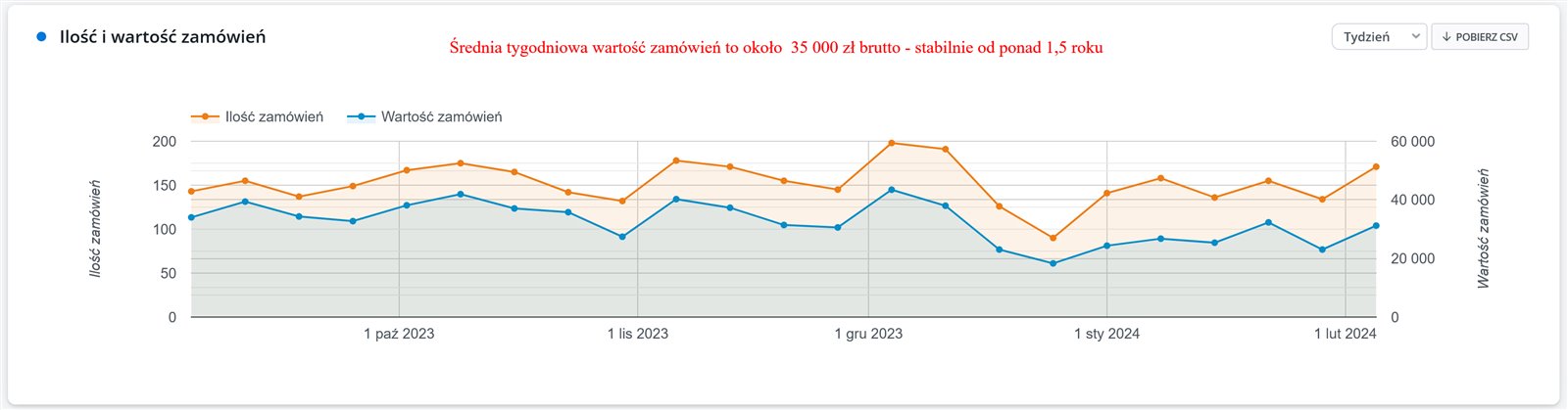 Stabilna sprzedaż od początku istnienia sklepu - średnia to 35 000 zł brutto tygodniowo przy marży około 100% na produktach.