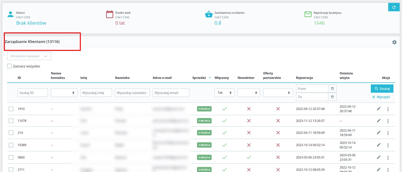 13 000 zarejestrowanych klientów, 1600 zapisanych do newslettera.
