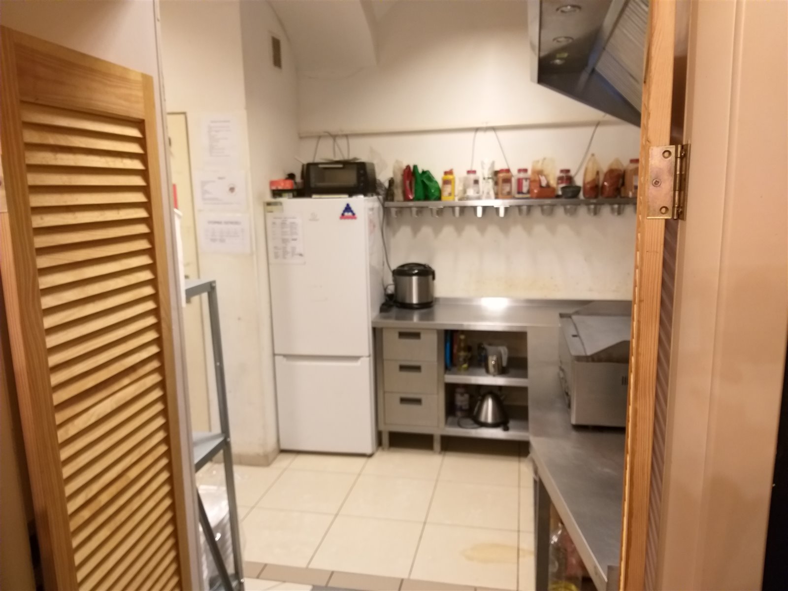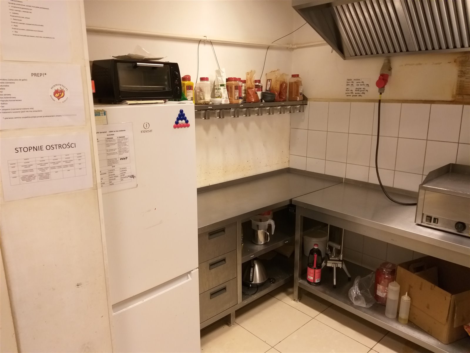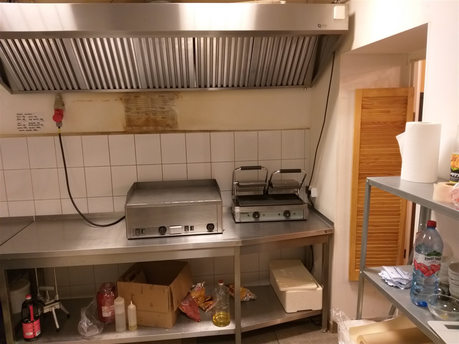 Okap z silnikiem, grill, opiekacz, stoły ze stali nie rdzewnej, lodówki itp