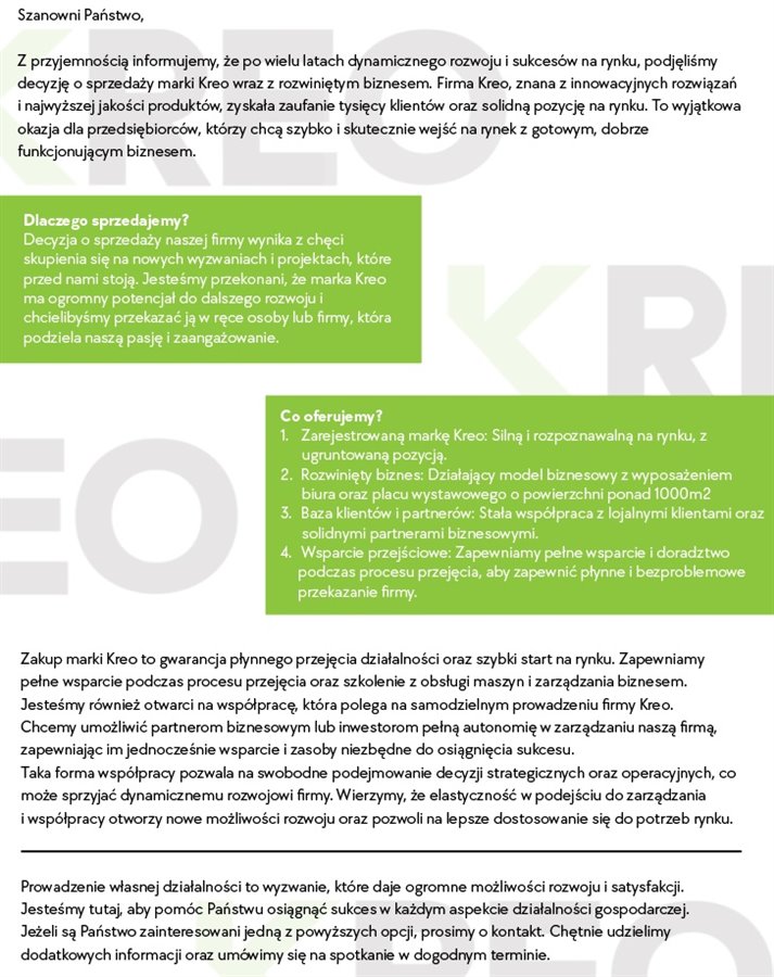 Decyzja o sprzedaży naszej firmy wynika z chęci skupienia się na nowych wyzwaniach i projektach, które przed nami stoją. Jesteśmy przekonani, że marka Kreo ma ogromny potencjał do dalszego rozwoju i chcielibyśmy przekazać ją w ręce osoby lub firmy, która podziela naszą pasję i zaangażowanie.