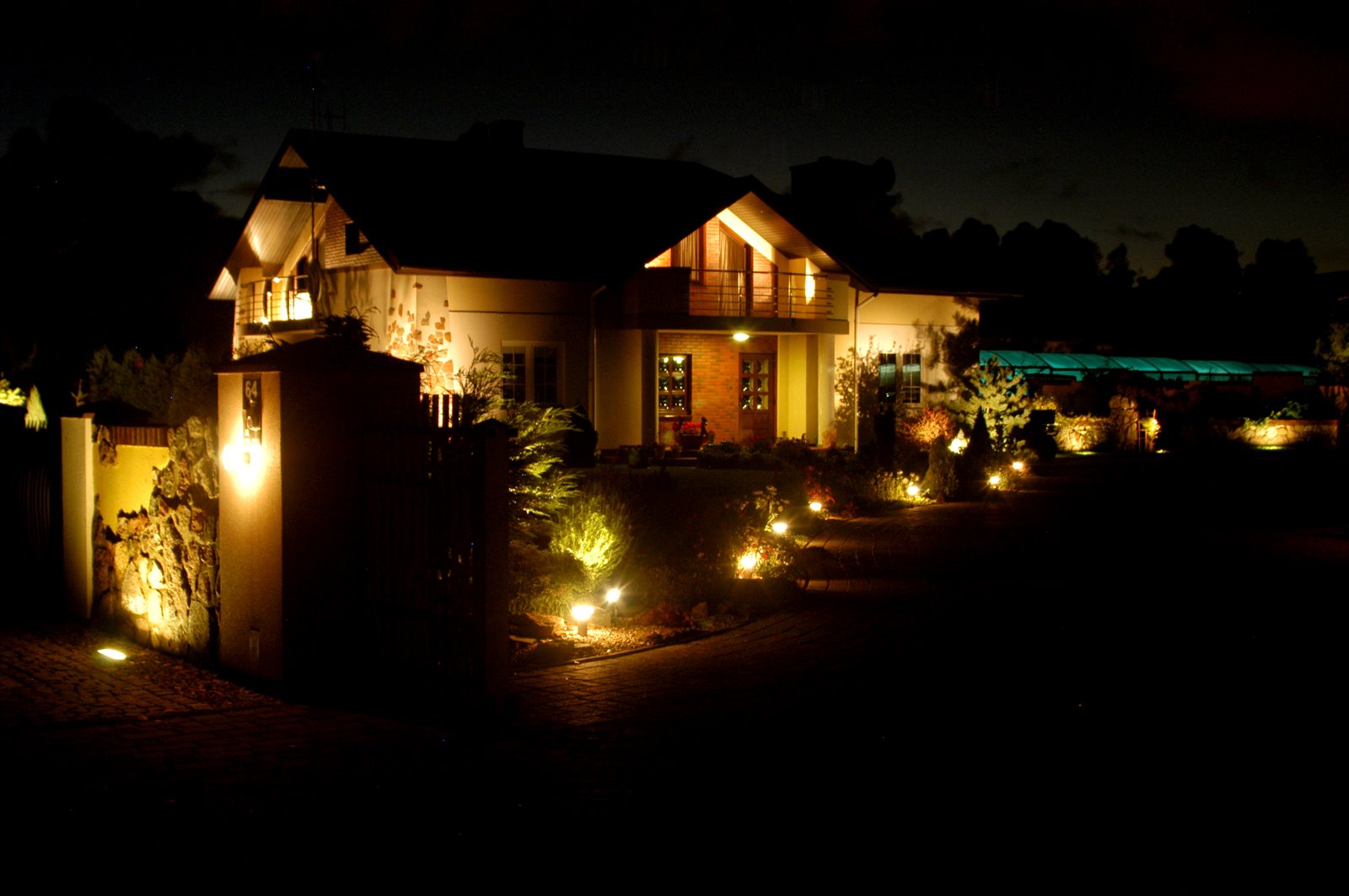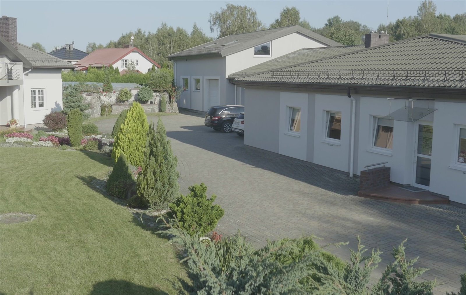 Oba obiekty usytuowane są na działce o pow. 0,37ha w spokojnej dzielnicy w bezpośrednim sąsiedztwie ogrodów działkowych. Na posesji znajduje się oczko wodne, duży obsługiwany komputerowo basen z ozonowaną i podgrzewaną wodą, przykryty teleskopowym zadaszeniem z poliwęglanu , pięknie urządzone i zadbane ogrody z ciekawą architekturą i wieloma punktami świetlnymi, licznymi drzewami, krzewami i kwiatami.