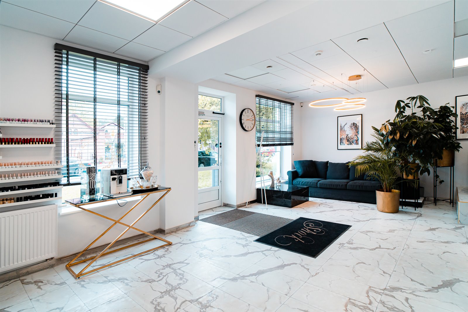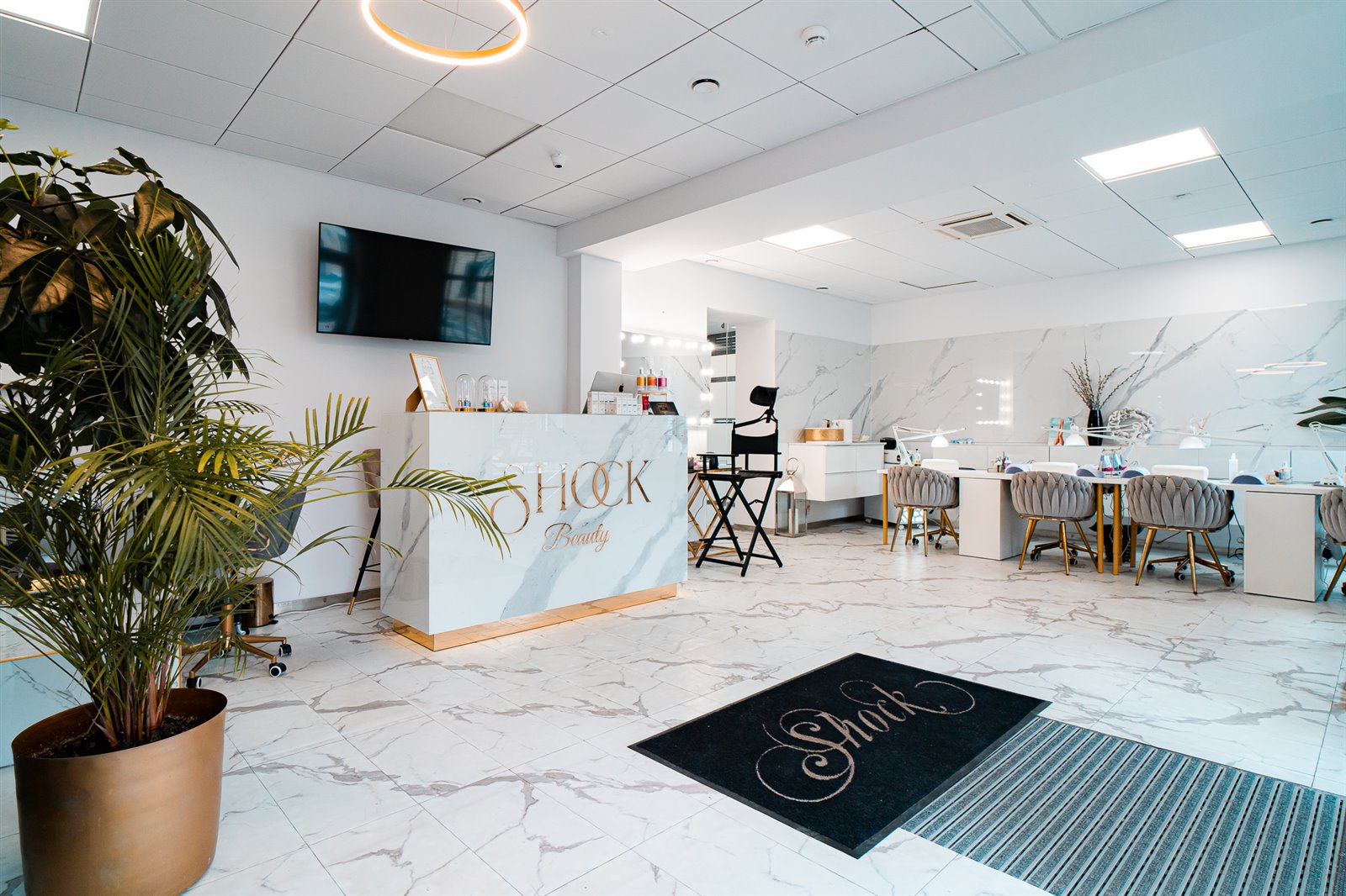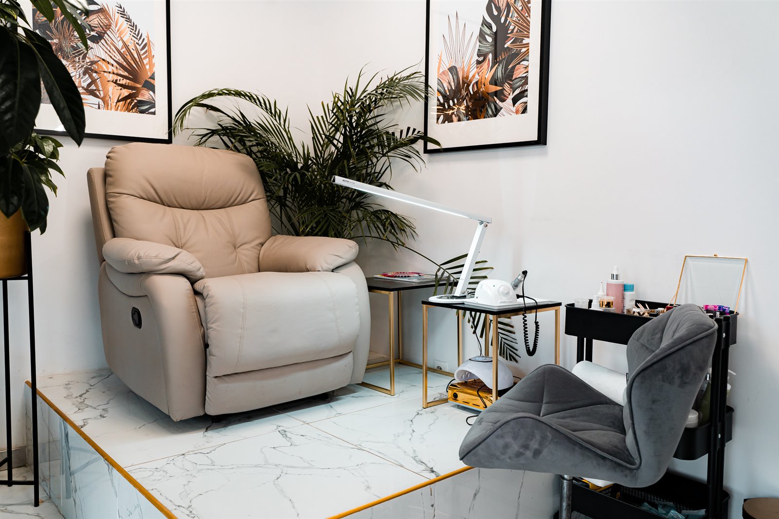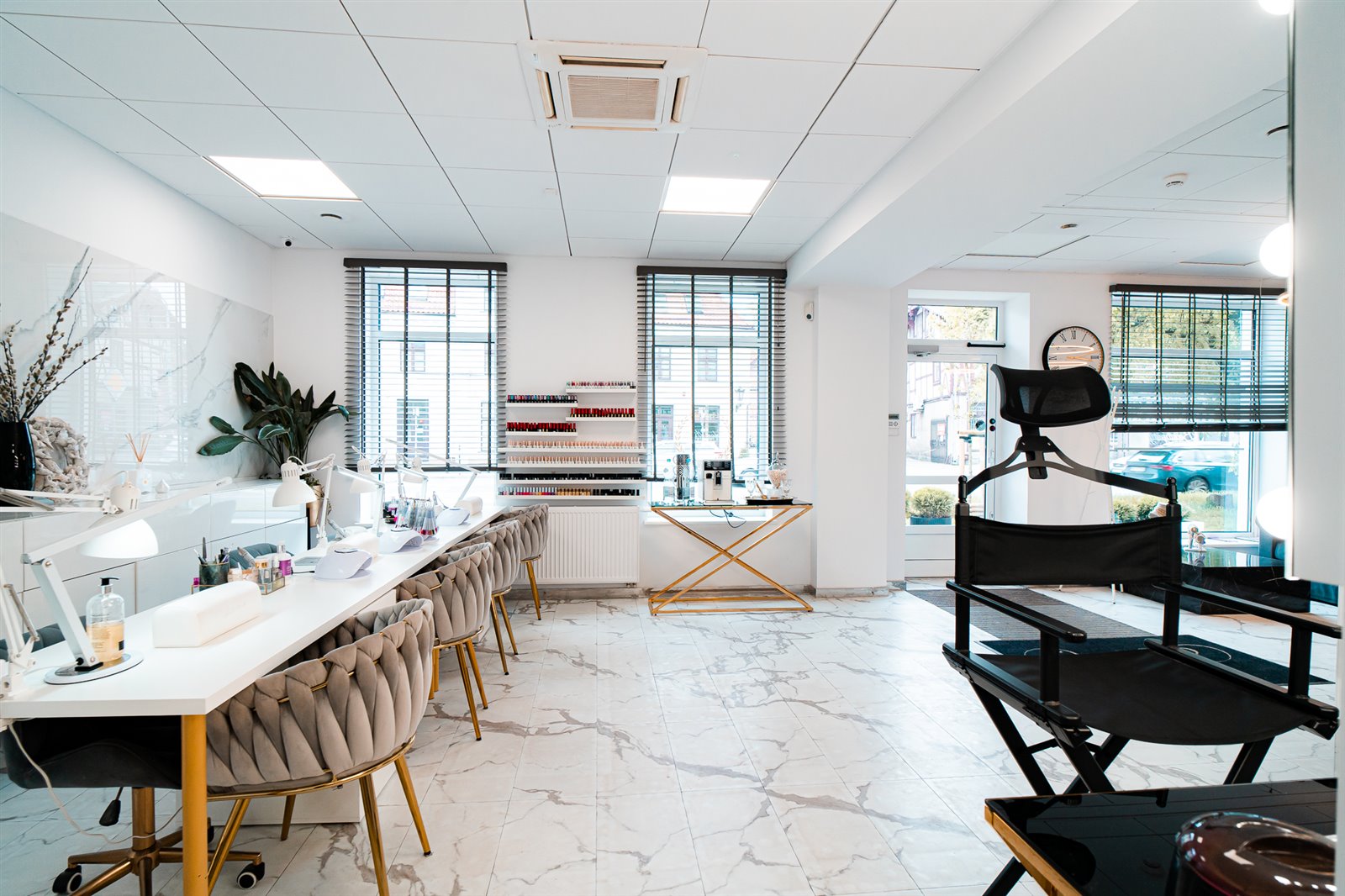 Recepcja, tv, fotel pedicure, kanapa, autoklaw Enbio, wyposażenie do pedicure, stoły i krzesła do manicure z pochłaniaczami Vento, w pełni wyposażone stanowiska do manicure, około 300 kolorów lakierów, ekspres, w pełni wyposażone stanowisko do stylizacji brwi, lustro z oświetleniem, konsola oraz fotel.