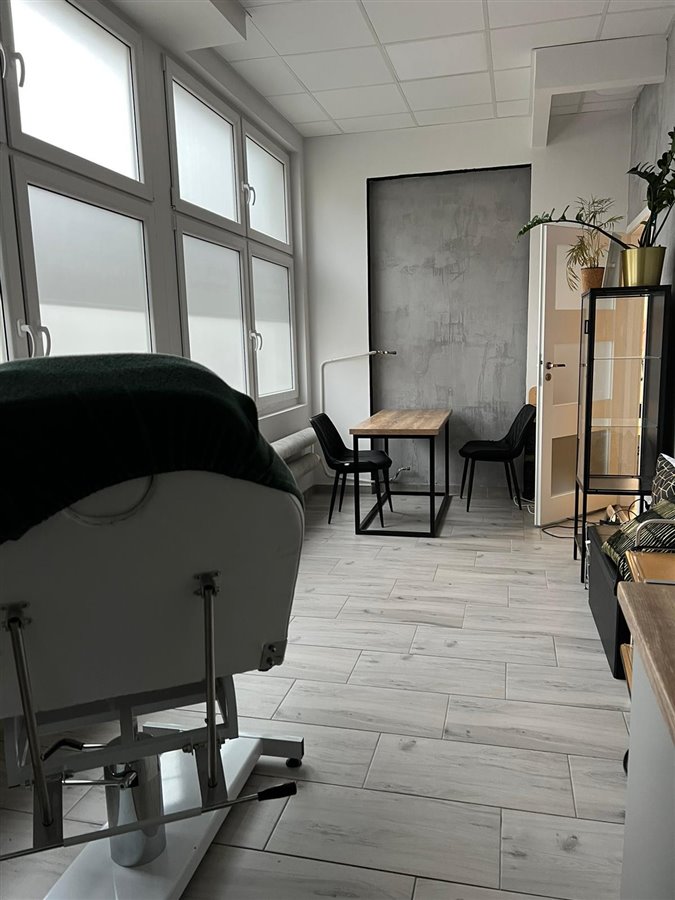 Recepcja i poczekalnia : gablotka, biurko, ekspres do kawy, telewizor, PlayStation + gry, kanapa, stolik, barek, szafa ba okrycia wierzchnie. Gabinet zabiegowy - gablotka na kosmetyki, zabudowa składająca się z mebli - szafki wiszące i stojące, zlew, łóżko kosmetyczne, stół do manicure, 2 lub 4 krzesła, skrzynia do przechowywania, lampa lupą, stolik zabiegowy - PRL,