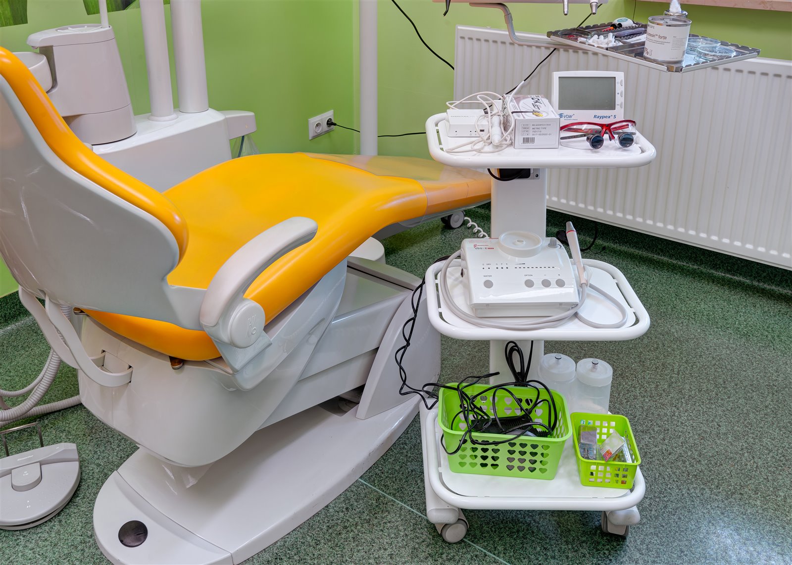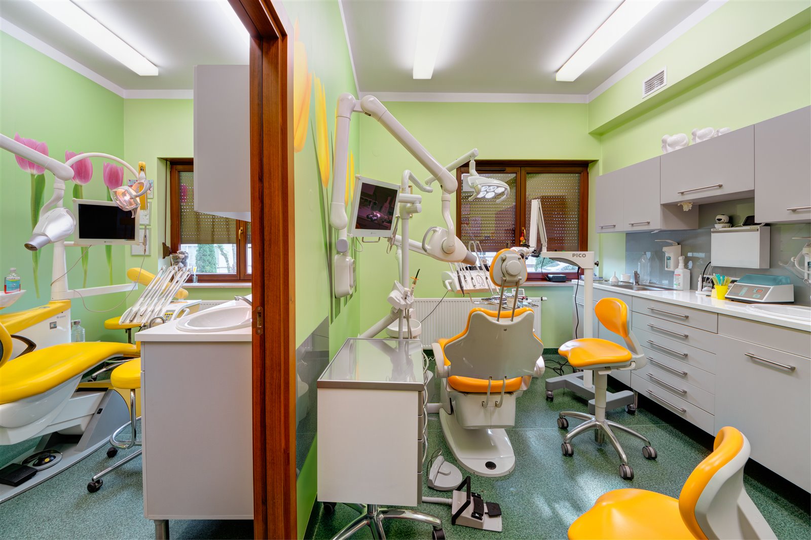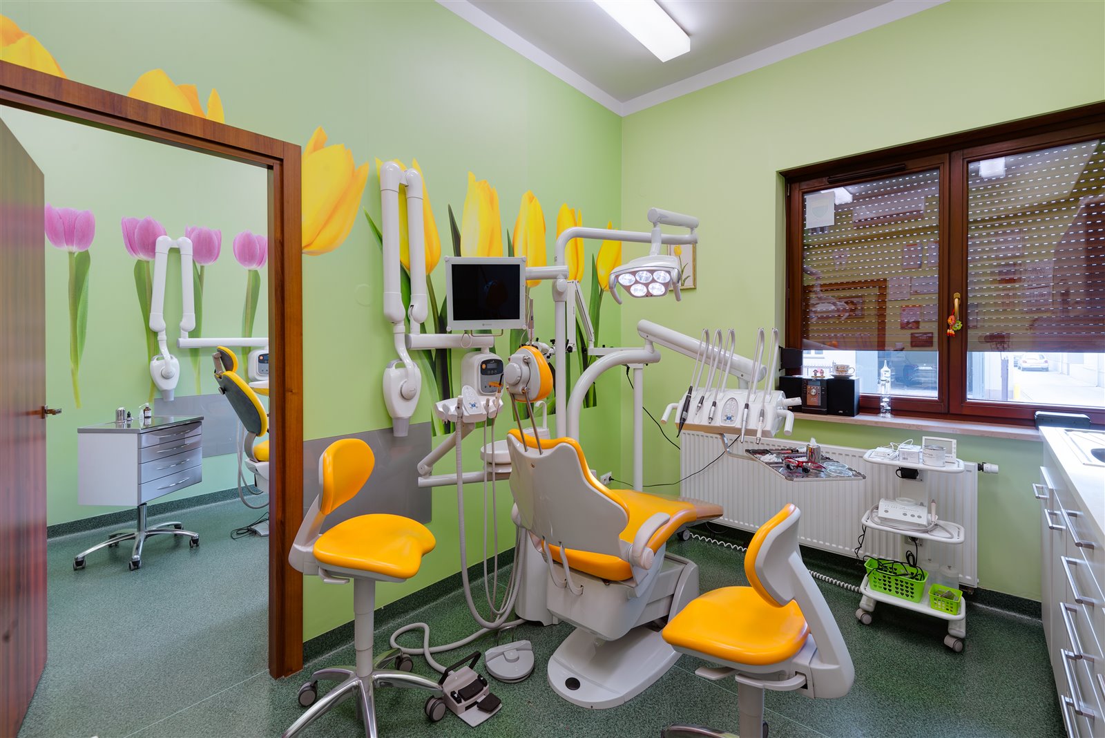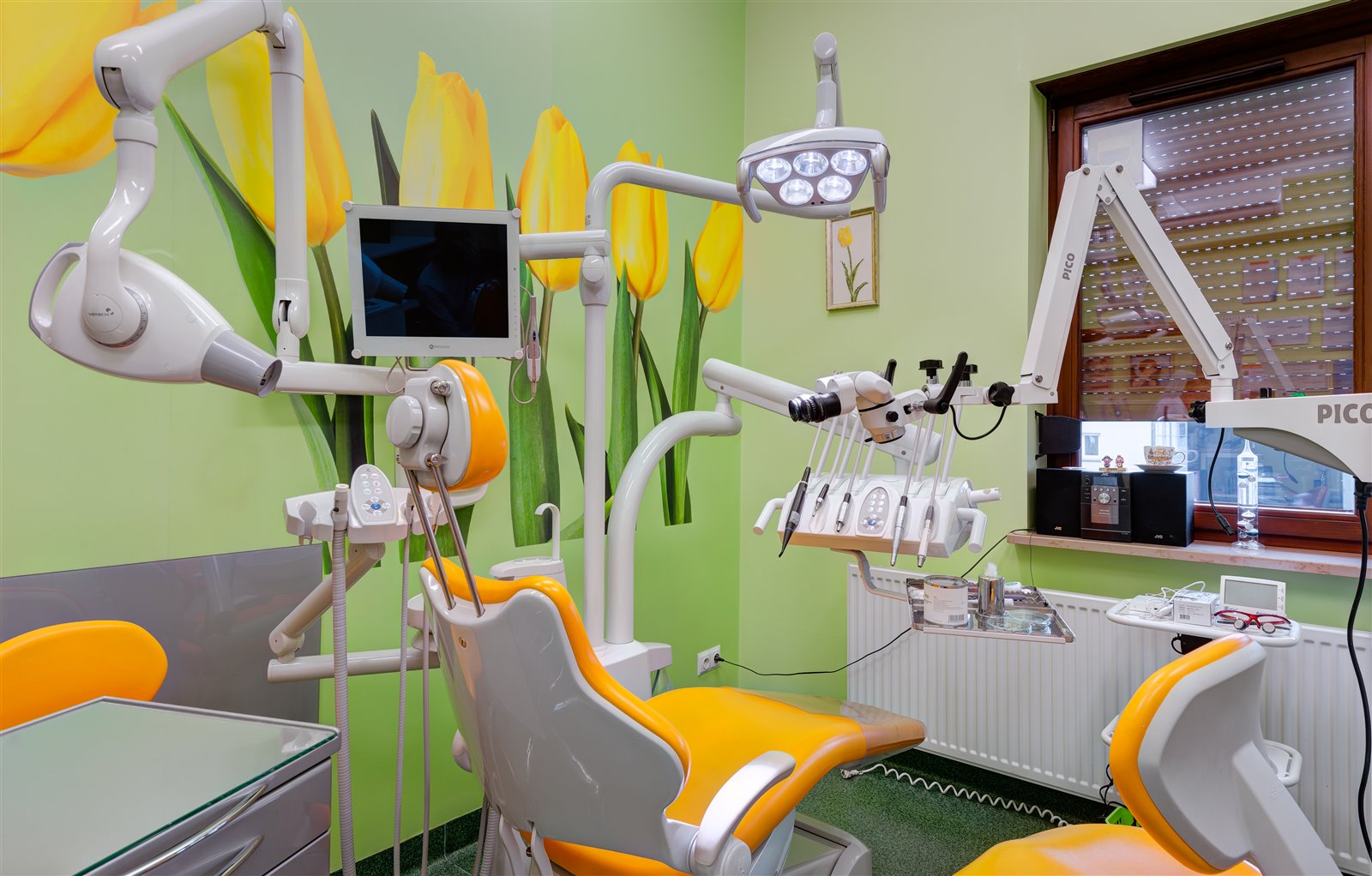 Nowoczesny, dwustanowiskowy gabinet (dwa osobne pokoje zabiegowe), wyposażony jest między innymi w dwa unity stomatologiczne na wodę destylowaną, dwie kamery wewnątrzustne, 2 aparaty RVG, mikroskop endodontyczny, lupy, znieczulenie komputerowe, ultradźwięki do opracowywania kanałów korzeniowych, autoklaw z drukarką, itd.