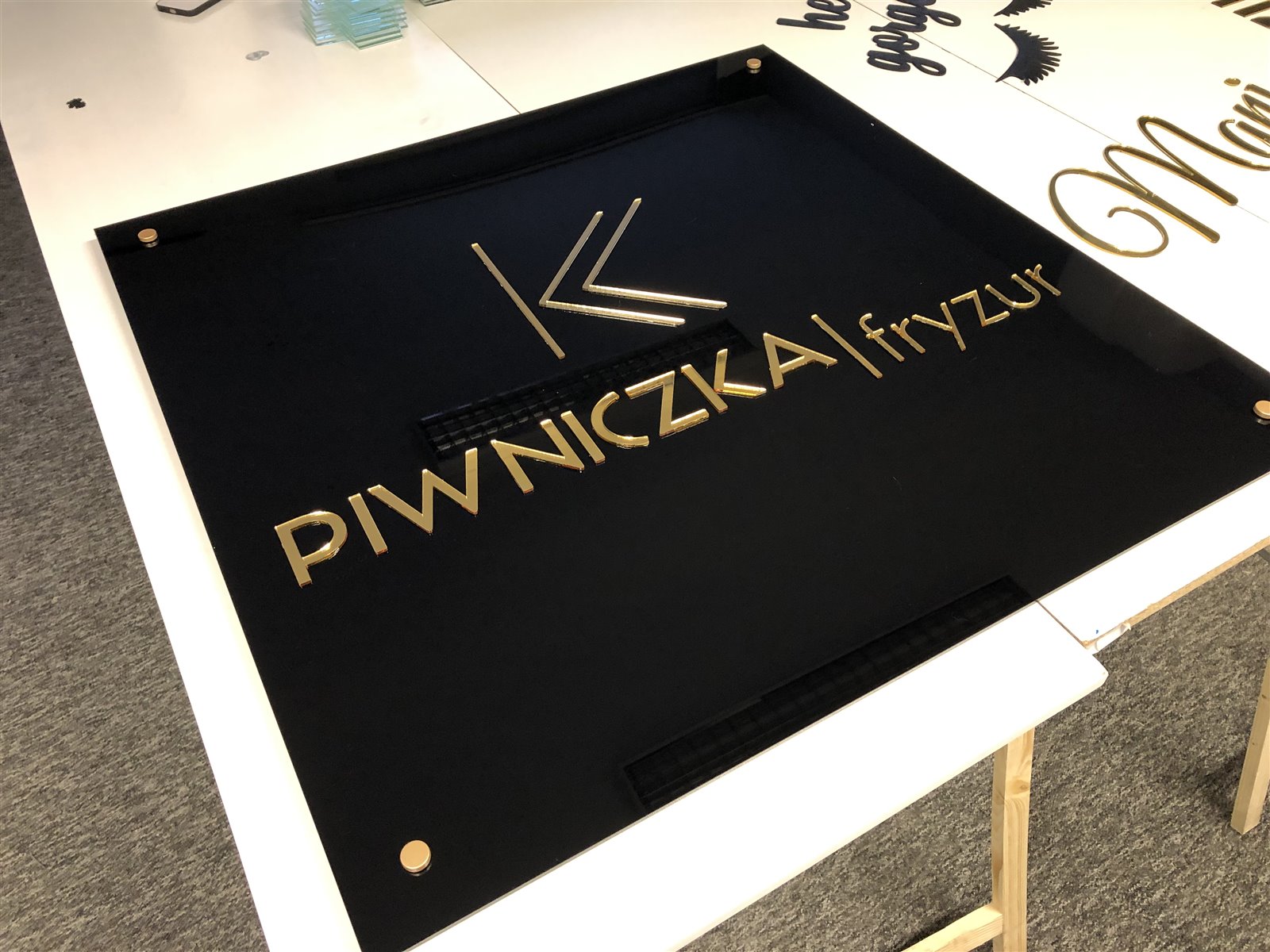 Logotypy z plexi złote i srebrne lustro, szyldy, reklamy, logo 3D.