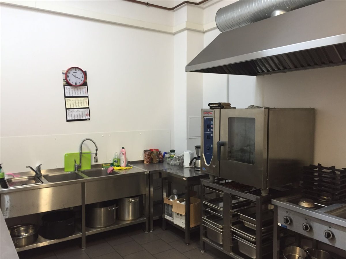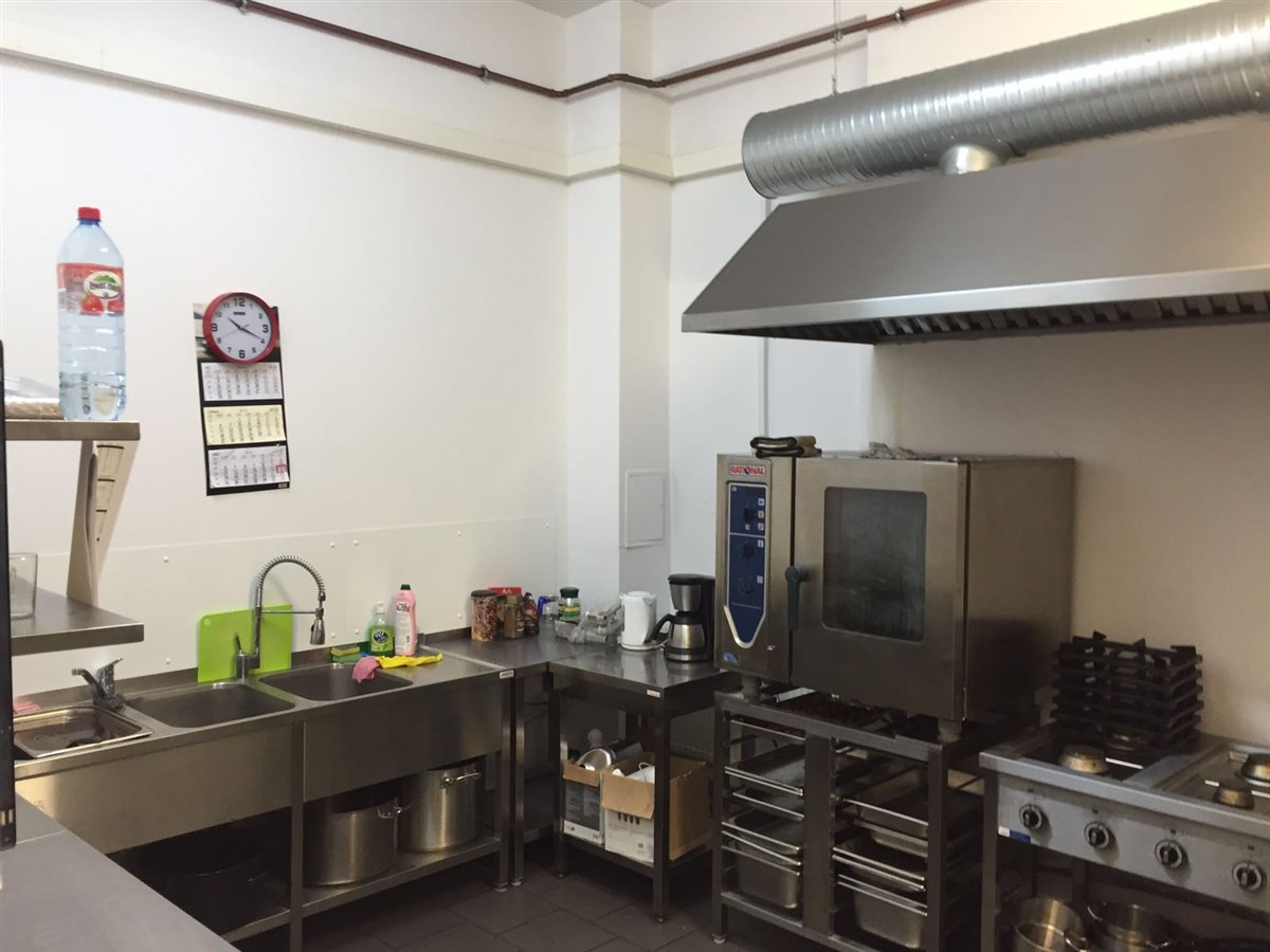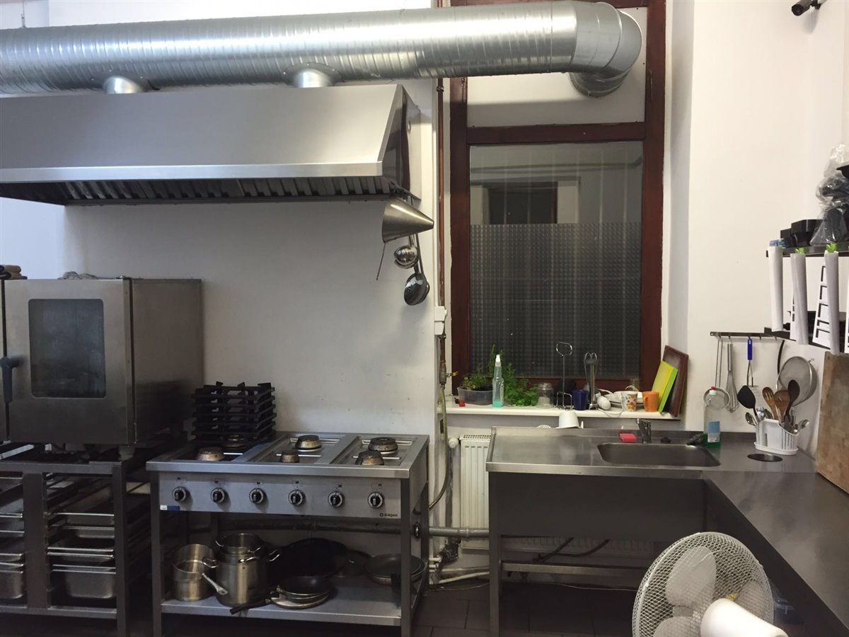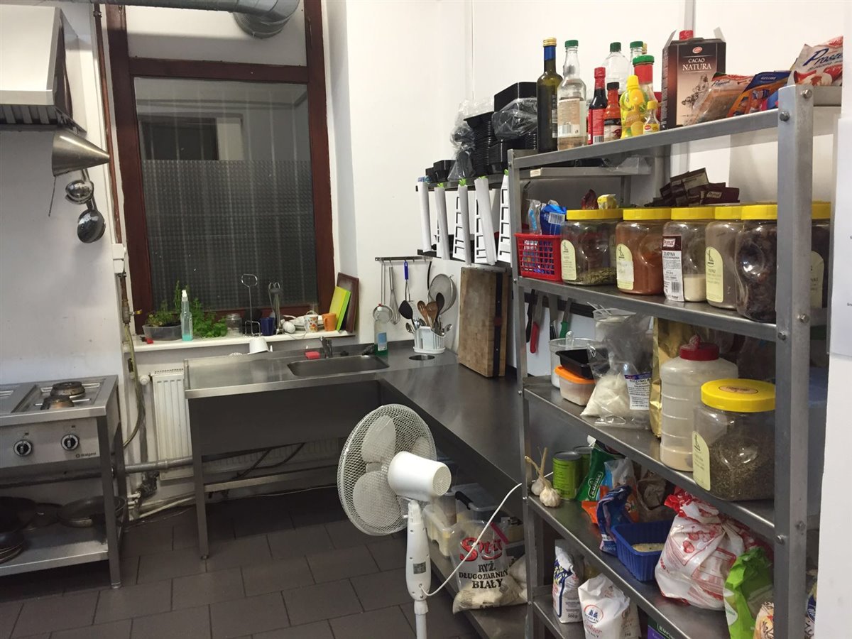 Pełne wyposażenie: piec gazowy 5 palnikowy, piec parowy, lodówki, chłodnia, lady aluminiowe gastronomiczne, 2 zlewy, wentylacja mechaniczna, pochłaniacz, zmywarki, stoły gastronomiczne, regały, dwa samochody.