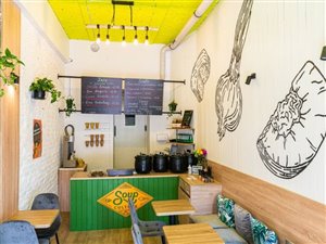 Ściana nad miejscem sprzedaży pomalowana jest farbą tablicową, co daje możliwość swobodnej zmiany menu.