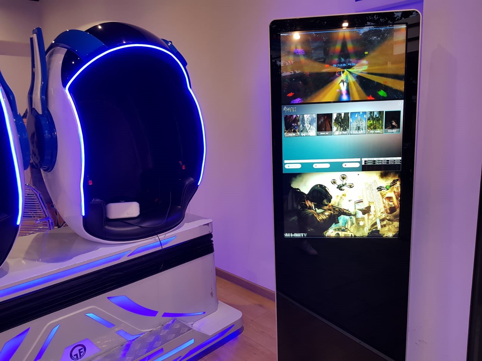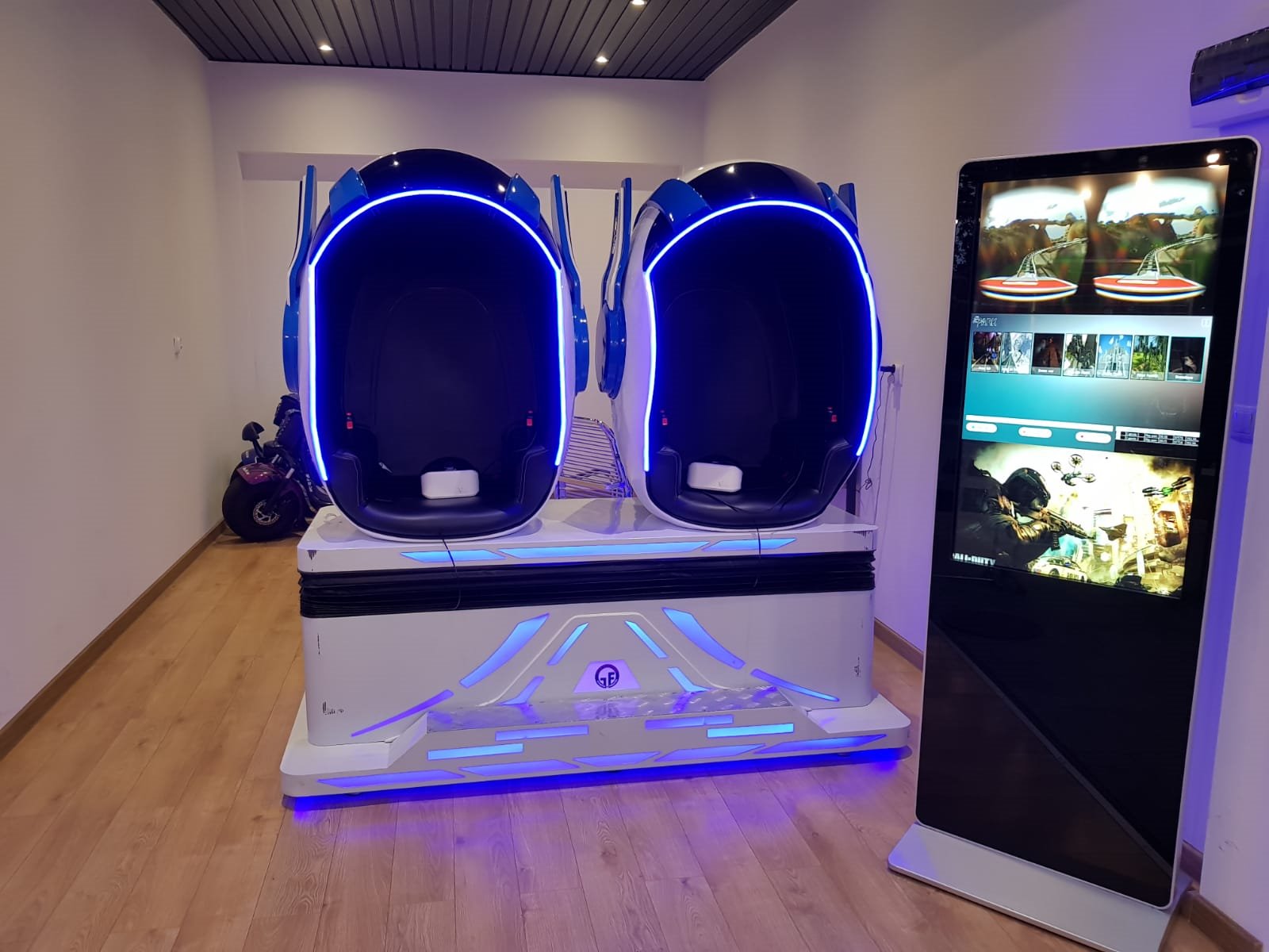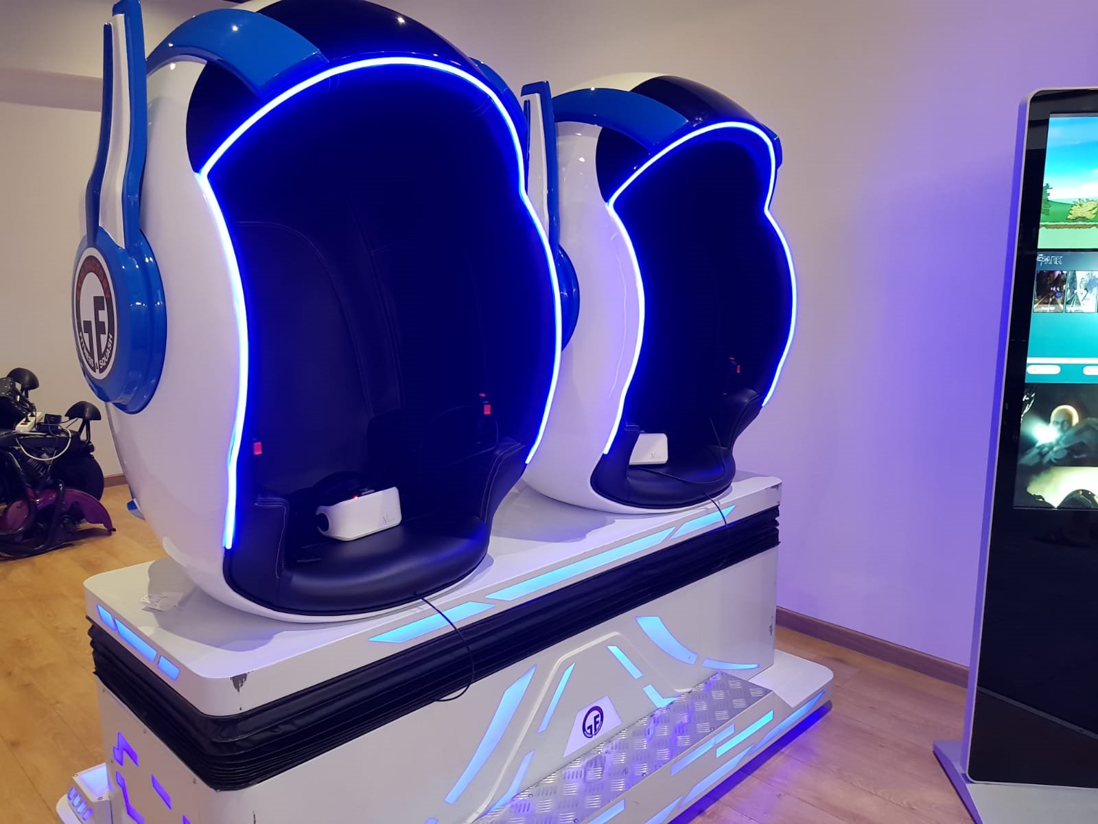 • Wysokiej jakości symulator VR: Dwa wygodne fotele w kształcie jajek, umieszczone na ruchomej platformie, z zamontowanymi głośnikami oraz okularami VR 360°, które zapewniają pełne zanurzenie w wirtualnej rzeczywistości.