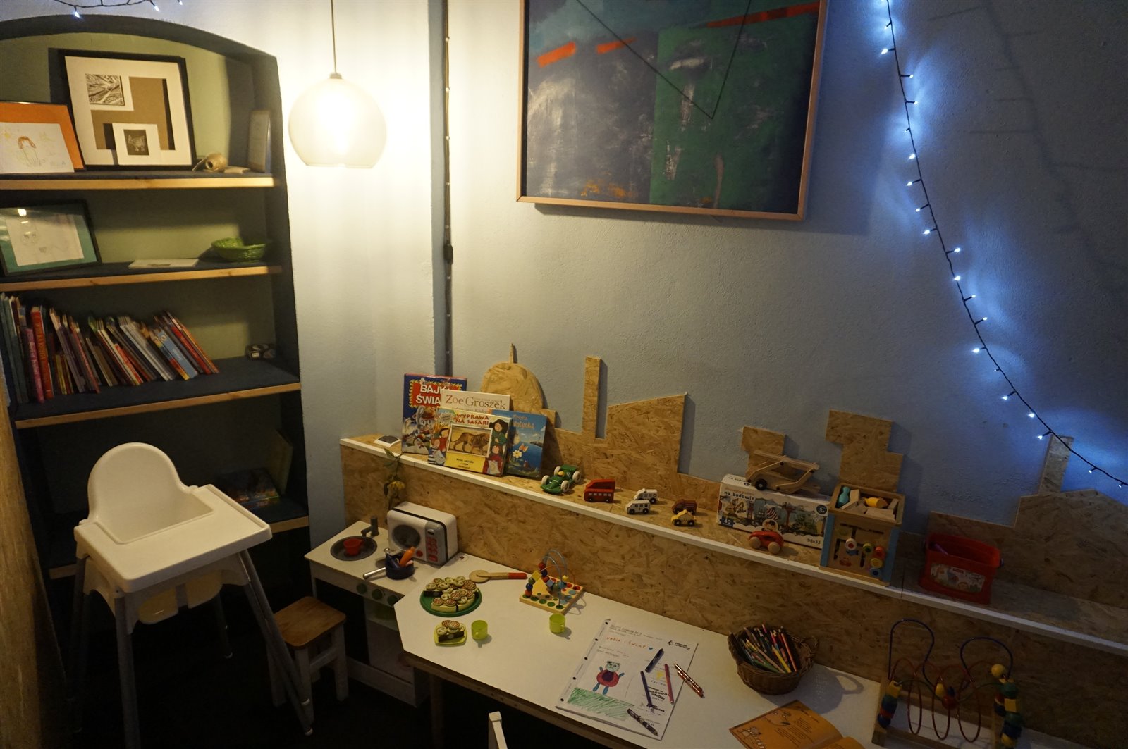 • zamykana salka dla dzieci (5m2), z regałami, stołem, siedzeniami, książkami, zabawkami.