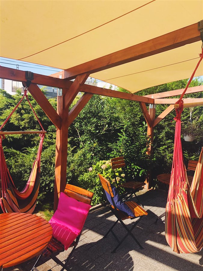 - meble zewnętrzne - stoliki z krzesłami drewniane.