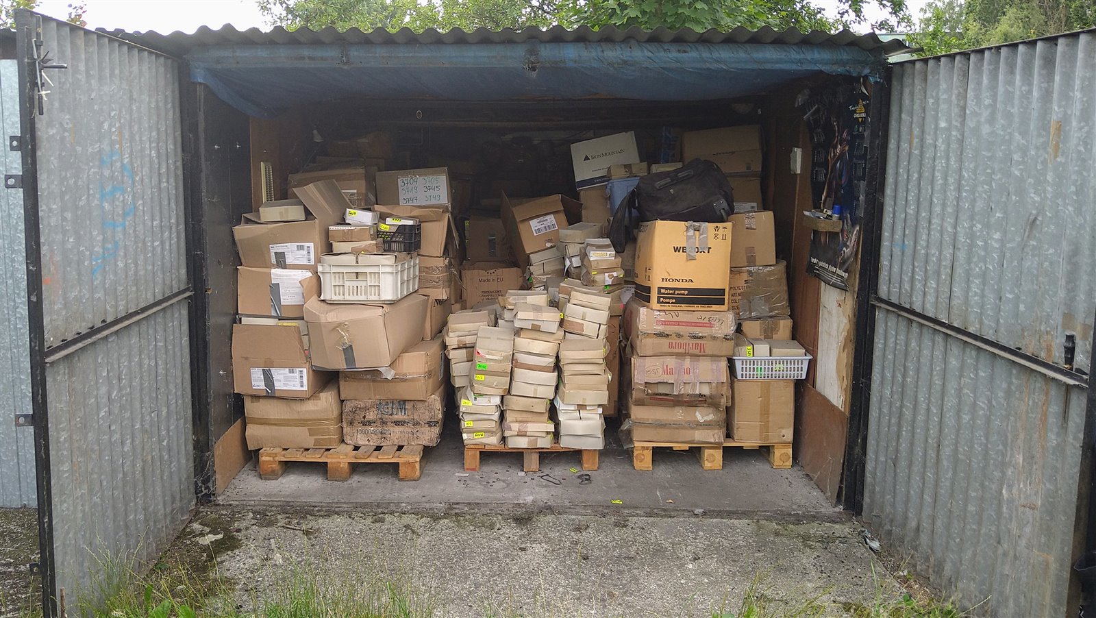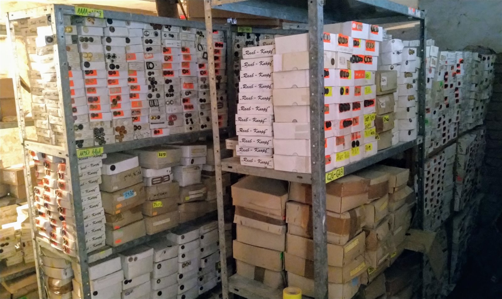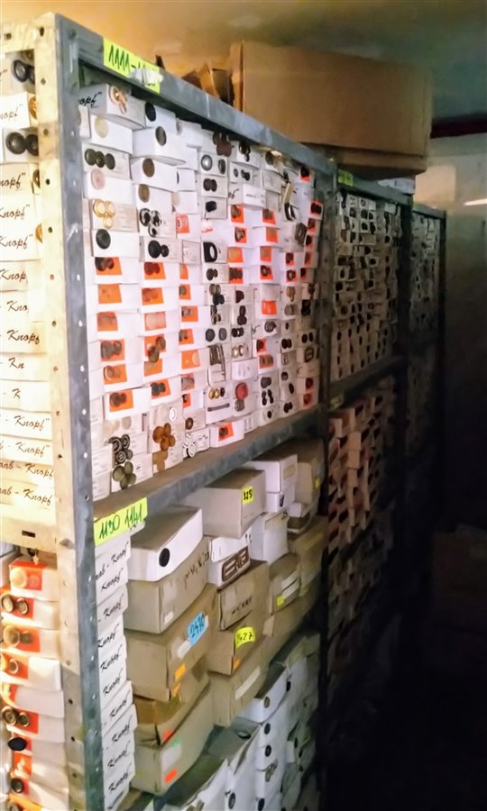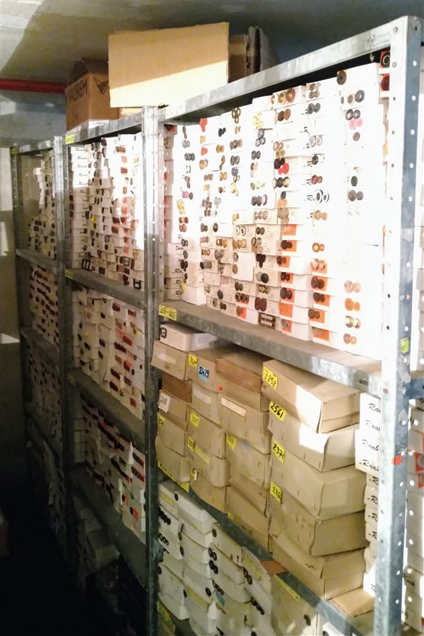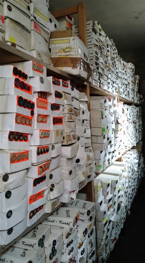 Dwa pomieszczenia magazynowe. Pierwsze z większą ilością guzików posegregowanych w kartonach – ok. 20 m3 produktów. Drugi roboczy magazyn (powierzchnia 21m2) to guziki pogrupowane rodzajami w kartonach z przydzielonymi numerami identyfikacyjnymi na regałach oraz nieliczne w plastikowych tubach.