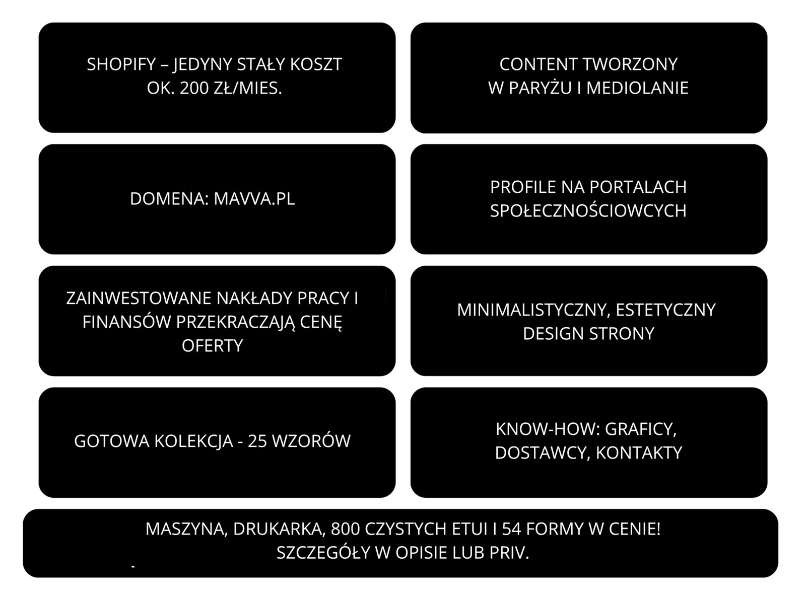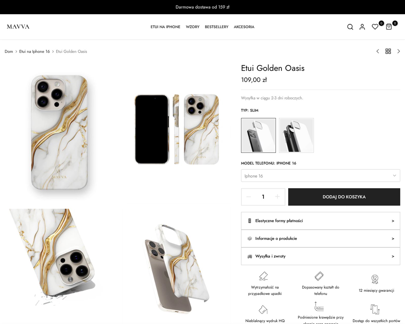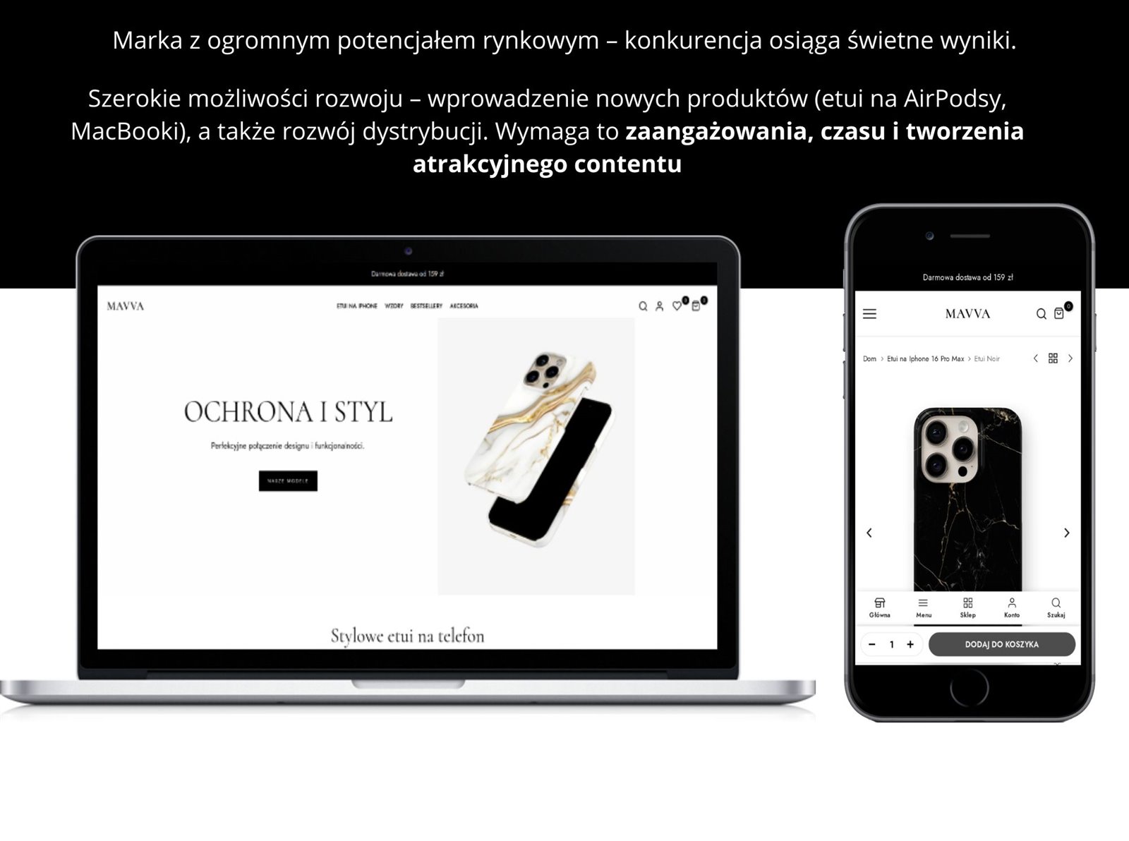Oferuję gotowy sklep internetowy MAVVA.PL, specjalizujący się w sprzedaży wysokomarżowych etui na telefony. Sklep działa na renomowanej platformie Shopify, co zapewnia łatwą obsługę i skalowalność.