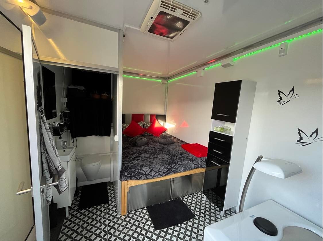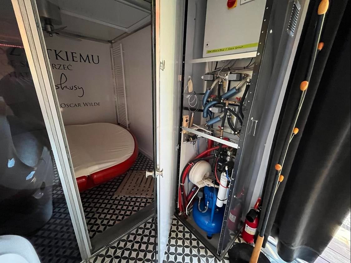 - Instalacja kanalizacyjna, wodociągowa i elektryczna: zbiorniki na ścieki 100 l i wodę czystą 100 l, bojler elektryczny 200l, instalacja elektryczna 230 V i 400 V z licznikiem, zainstalowana klimatyzacja/nagrzewnica elektryczna 7 kW, system/instalacja podłączania mediów zewnętrznych.