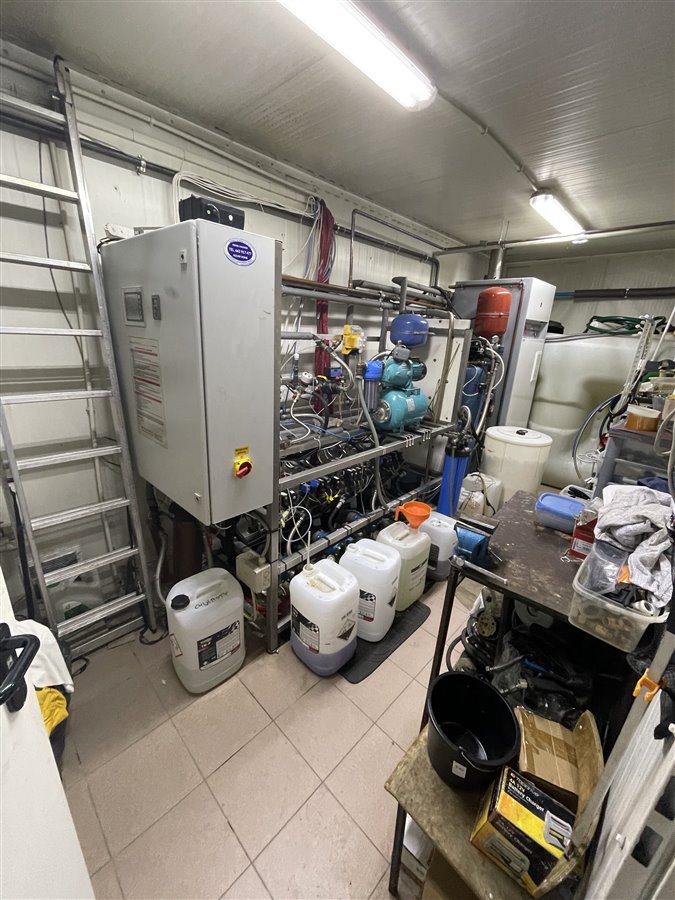 - cała technika, osprzęt, wysięgniki, duży zbiornik na wodę osmotyczną, pompy wszelkie, dozowniki, zapas chemii, części