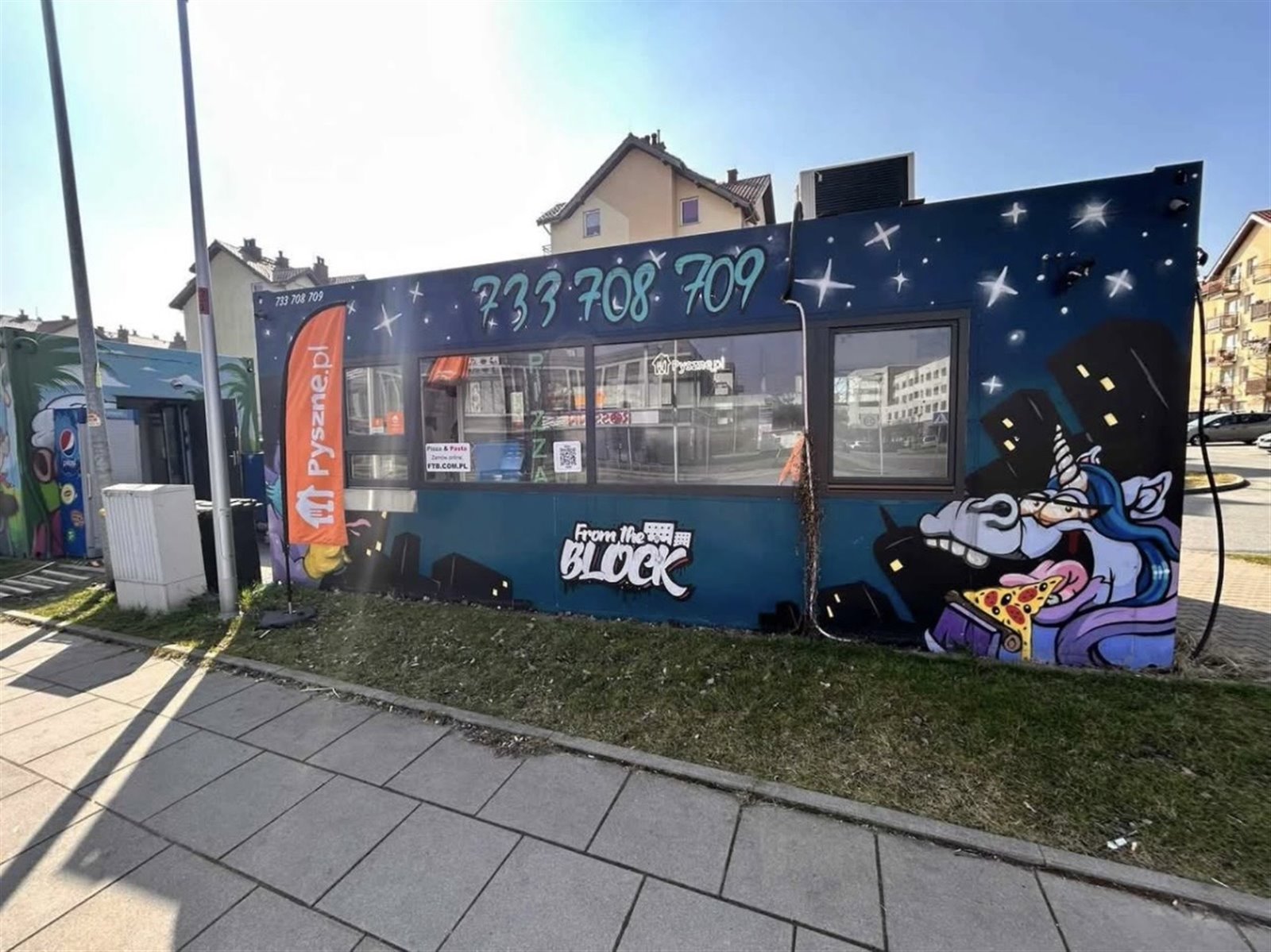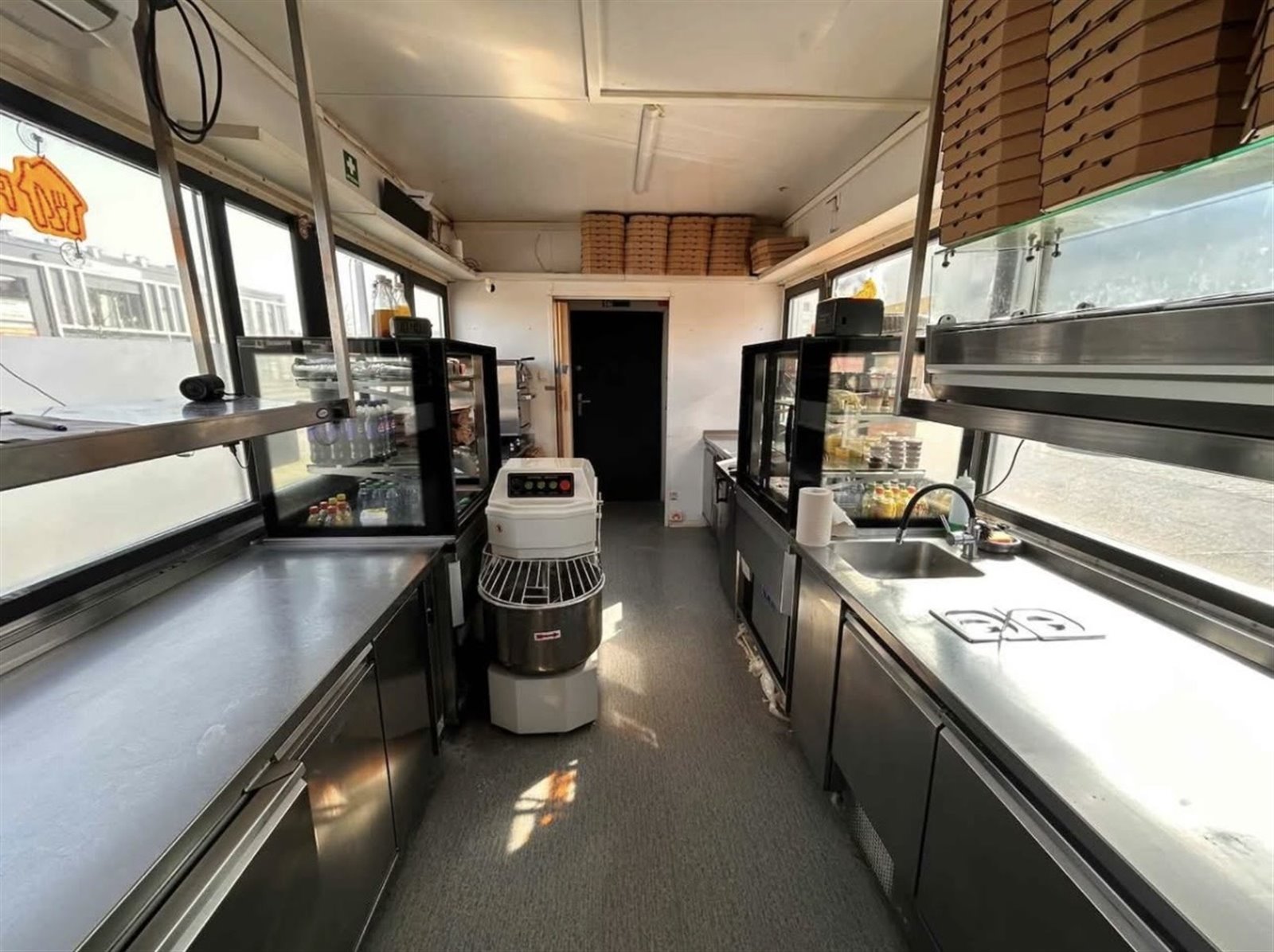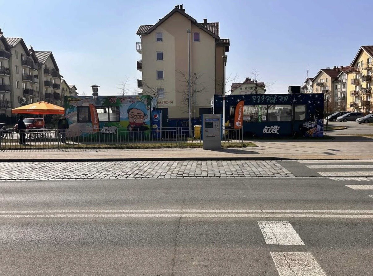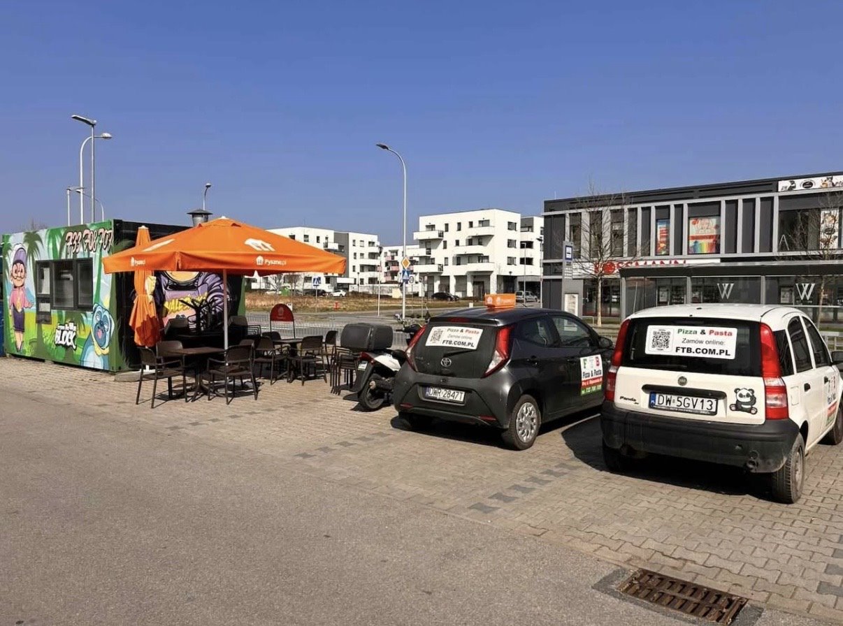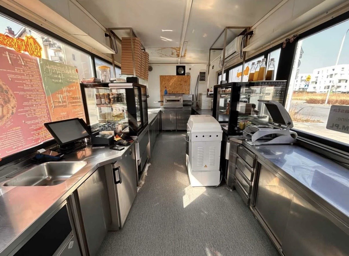 Moduł kontenerowy w pełnej własności, w pełni wyposażony w sprzęt gastronomiczny : piec przelotowy do pizzy, lodówki, zamrażarki, stoły robocze ze stali nierdzewnej, szafy chłodnicze, mikser planetarny, krajalnica i pozostałe urządzenia potrzebne do pracy. Wszystko sprawne i gotowe do użycia od pierwszego dnia.