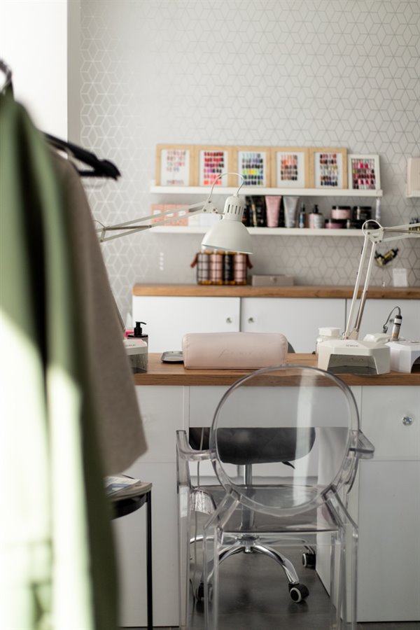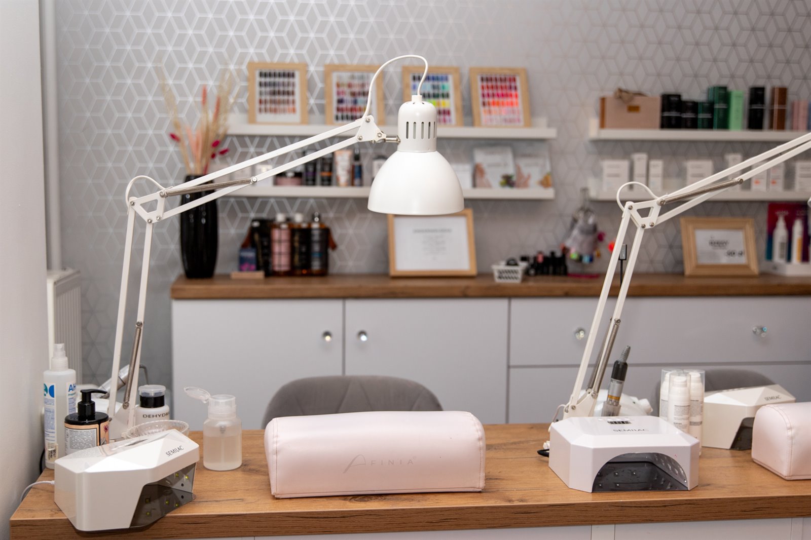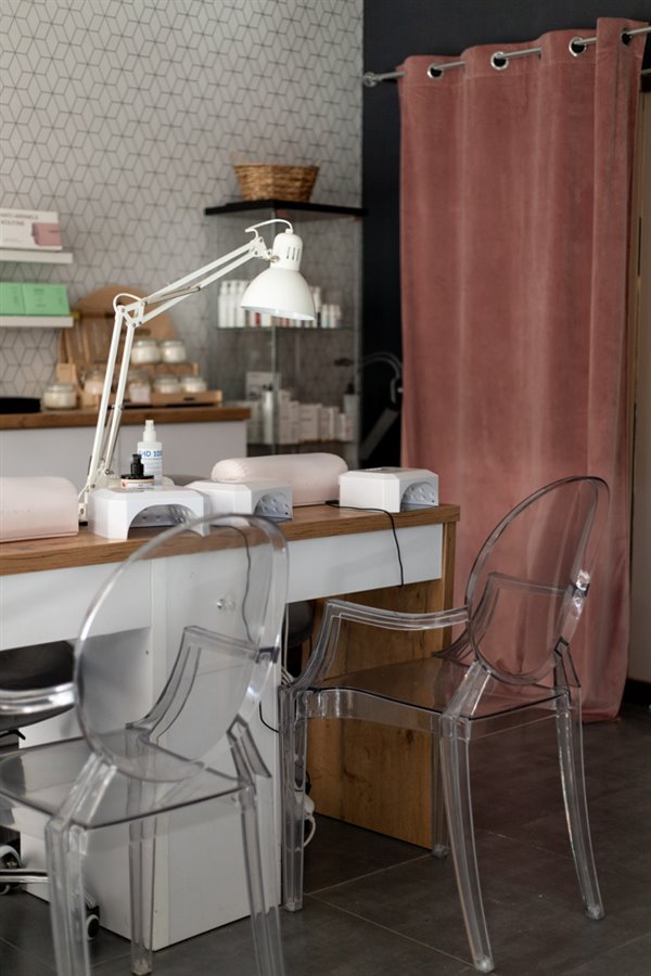 - 3 stanowiska do stylizacji paznokci wyposażone w pochłaniacze Afinia, frezarki Marathon i lampy UV