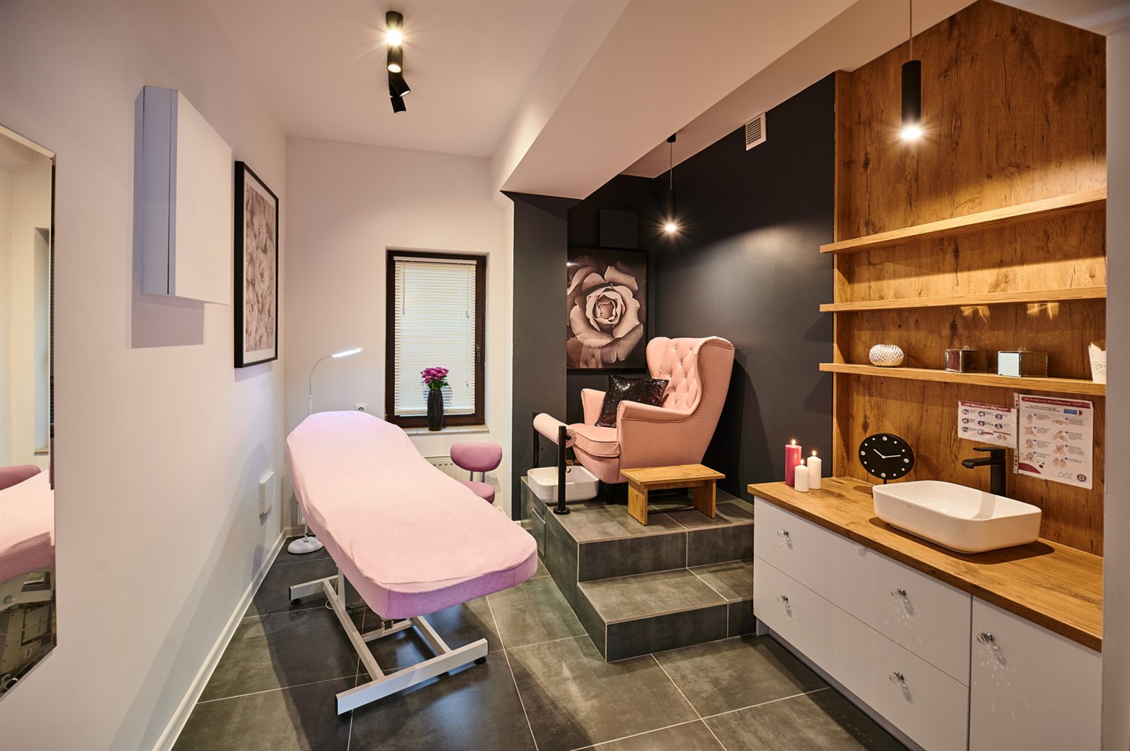 – 4 w pełni wyposażone gabinety zabiegowe ze stałą zabudową oraz wyposażone w lampy, stolik i elektryczne fotele, w tym jeden podologiczny