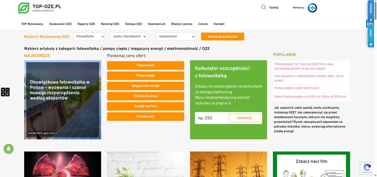 TOP-OZE.pl, to portal publikujący eksperckie treści, raporty, rankingi i narzędzia analityczne (np. kalkulator PV).