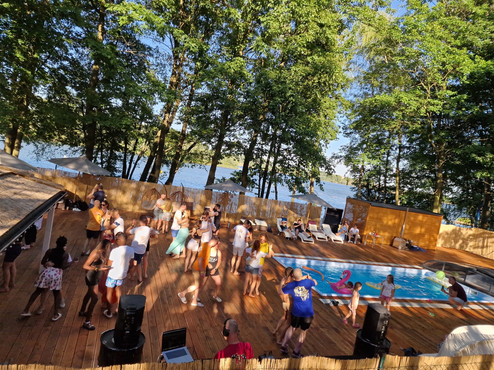500m2 strefa basenowa z krytym basenem 8x4m, podgrzewany pompa ciepla, z przeciwpradem, lezaki basenowe, baldachimy, lezanki, hustawki, bujaki, parasole. Kompleks sauna 6osobowa + balia ogrodowa (jacuzzi) 8osobowe - z widokiem na jezioro, prysznice plenerowe.