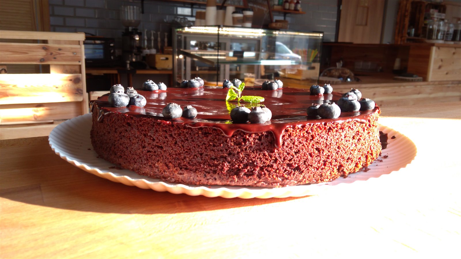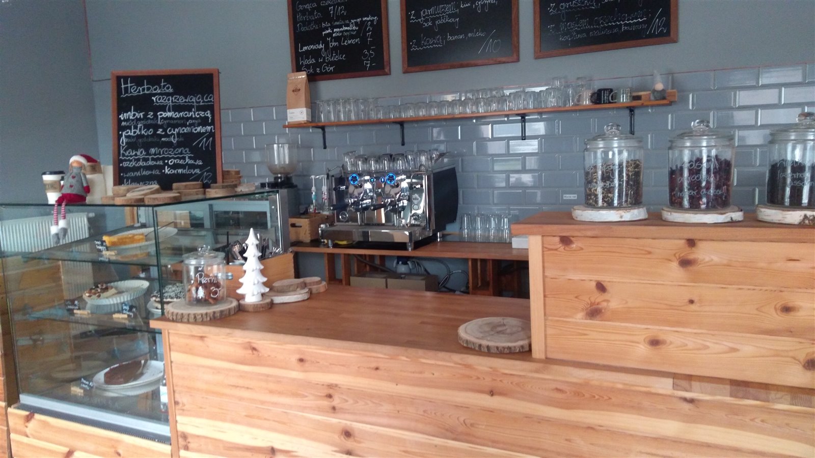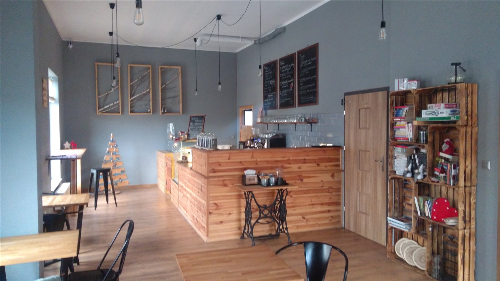 Przytulne wnętrze, drewniane stoły i zabudowa baru wykonane na zamówienie.