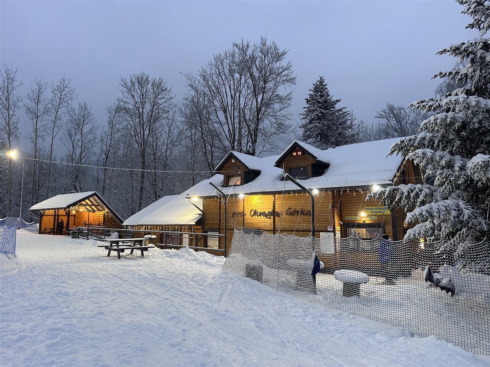 3) budynek z zapleczem gastronomicznym (Bacówka pod Okrągłą Górką – w pełni wyposażona kuchnia po remoncie oraz sala dla ok. 60 osób), wypożyczalnią sprzętu narciarskiego wraz z serwisem narciarskim, kasą wyciągów oraz zapleczem socjalnym
