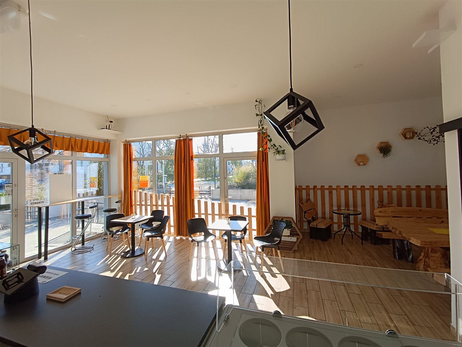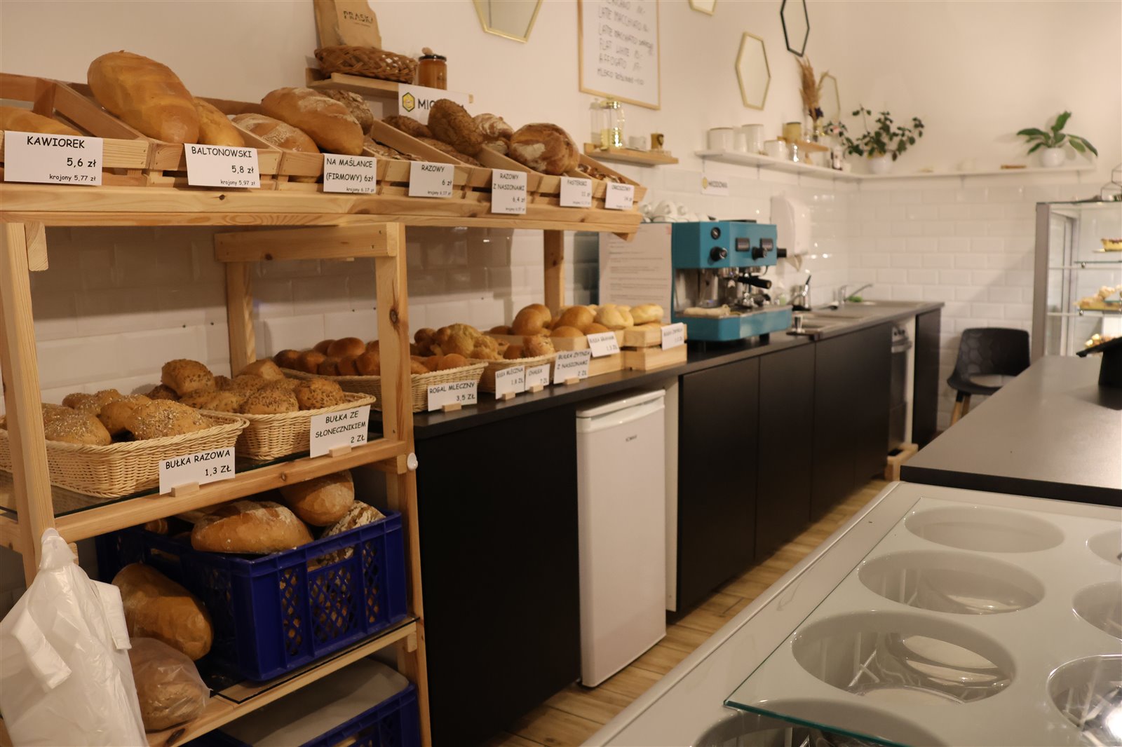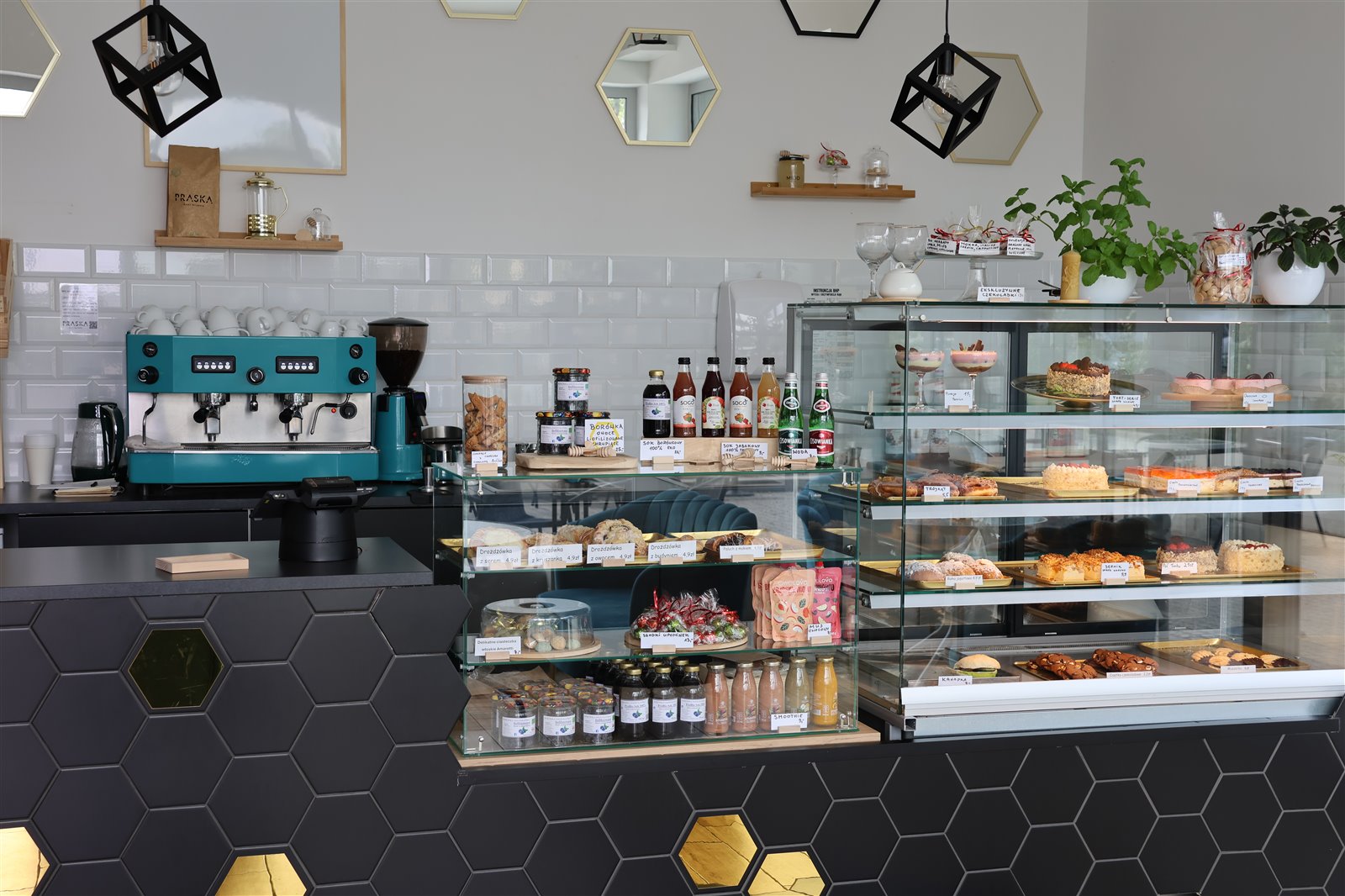 • Bar z kompletnym wyposażeniem – nowoczesny POS (kasa fiskalna z tabletem i wbudowanym terminalem płatniczym), szkło i inne sprzęty barowe: ekspres ciśnieniowy dwukolbowy z całym profesjonalnym osprzętem baristycznym (młynek, odbijak, dyspenser, kolby, tamper z podkładką, dzbanki do spieniania mleka), konserwator do lodów na osiem smaków z zapasem kuwet, nowa wyparzarko-zmywarka renomowanej firmy, duża witryna chłodnicza z tacami na ciasta, szklana witryna wystawowa neutralna, lodówka, robiony na wymiar regał ekspozycyjny na pieczywo z koszami wystawowymi, zabudowa barowa wykonana na zamówienie z efektownymi płytkami.