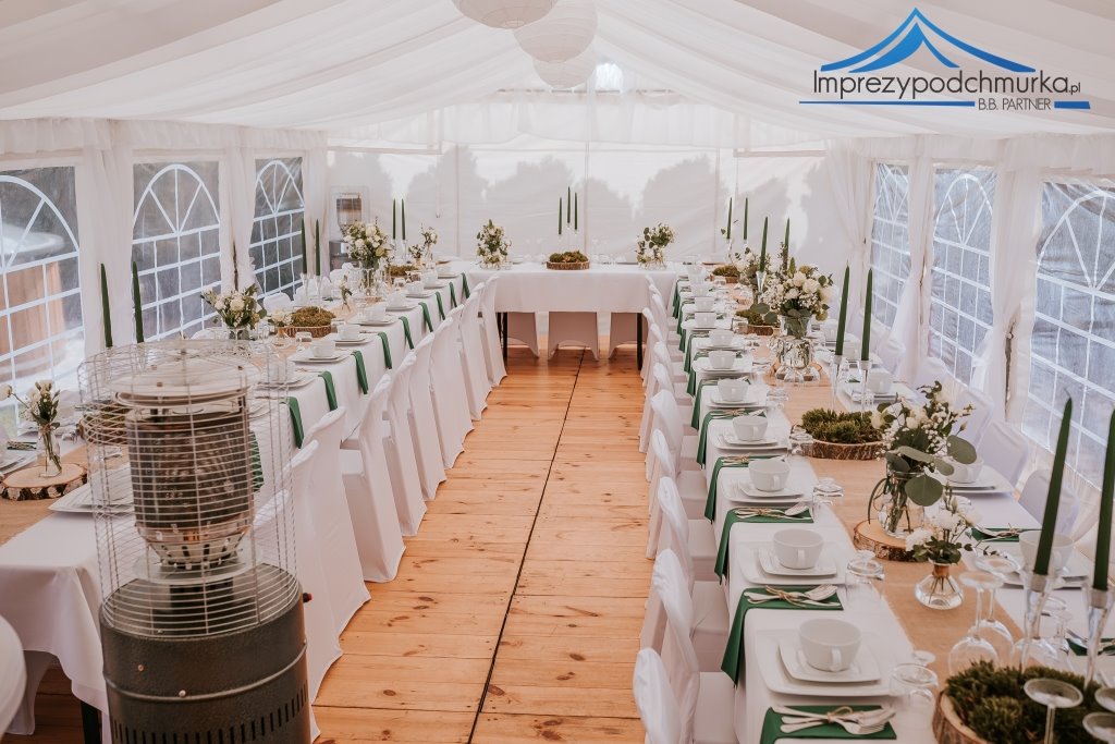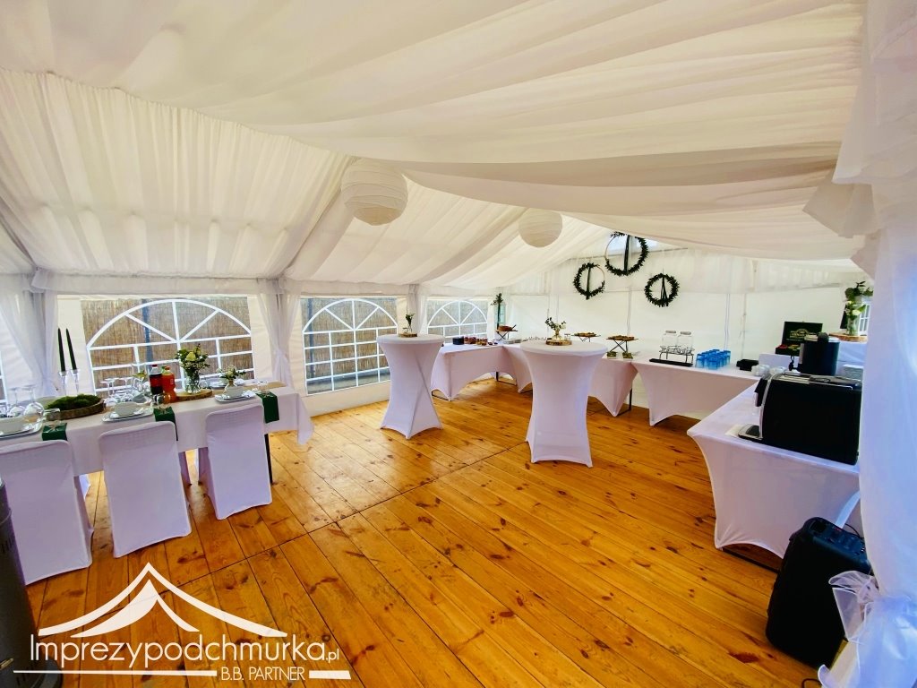 Na wyposażeniu: Namioty, drewniane podłogi, stoły, ławki, krzesła, dekoracje, zastawy stołowe, sprzęt montażowy, bus dostawczy i wiele innych sprzętów