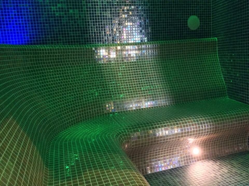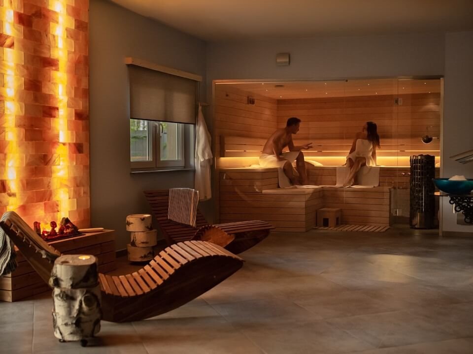 - pomieszczenie saunarium ze strefą relaksu: sauną fińską, łaźnią parową, podwójny prysznic, urządzenie do produkcji lodu, wanna Jacuzzi, kominek elektryczny, leżaki.