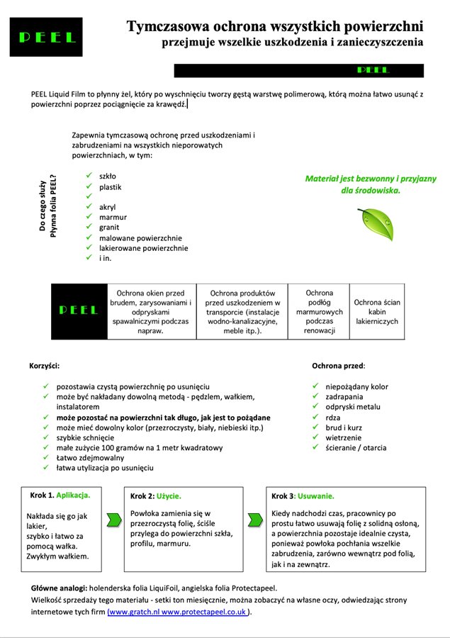 PEEL to innowacyjny produkt do tymczasowej ochrony różnych powierzchni przed zabrudzeniami i uszkodzeniami. Po wyschnięciu tworzy gęstą polimerową powłokę, którą można łatwo usunąć. Produkt nadaje się do ochrony szkła, plastiku, metalu, akrylu, marmuru, granitu i innych nieporowatych powierzchni.