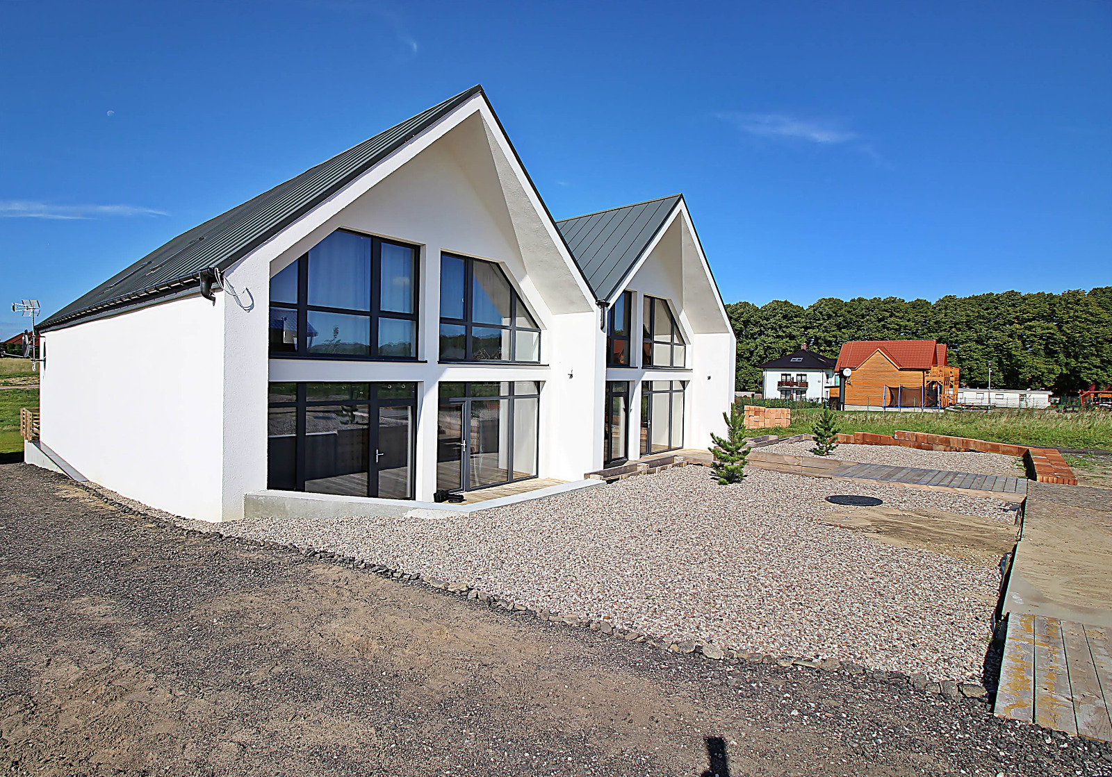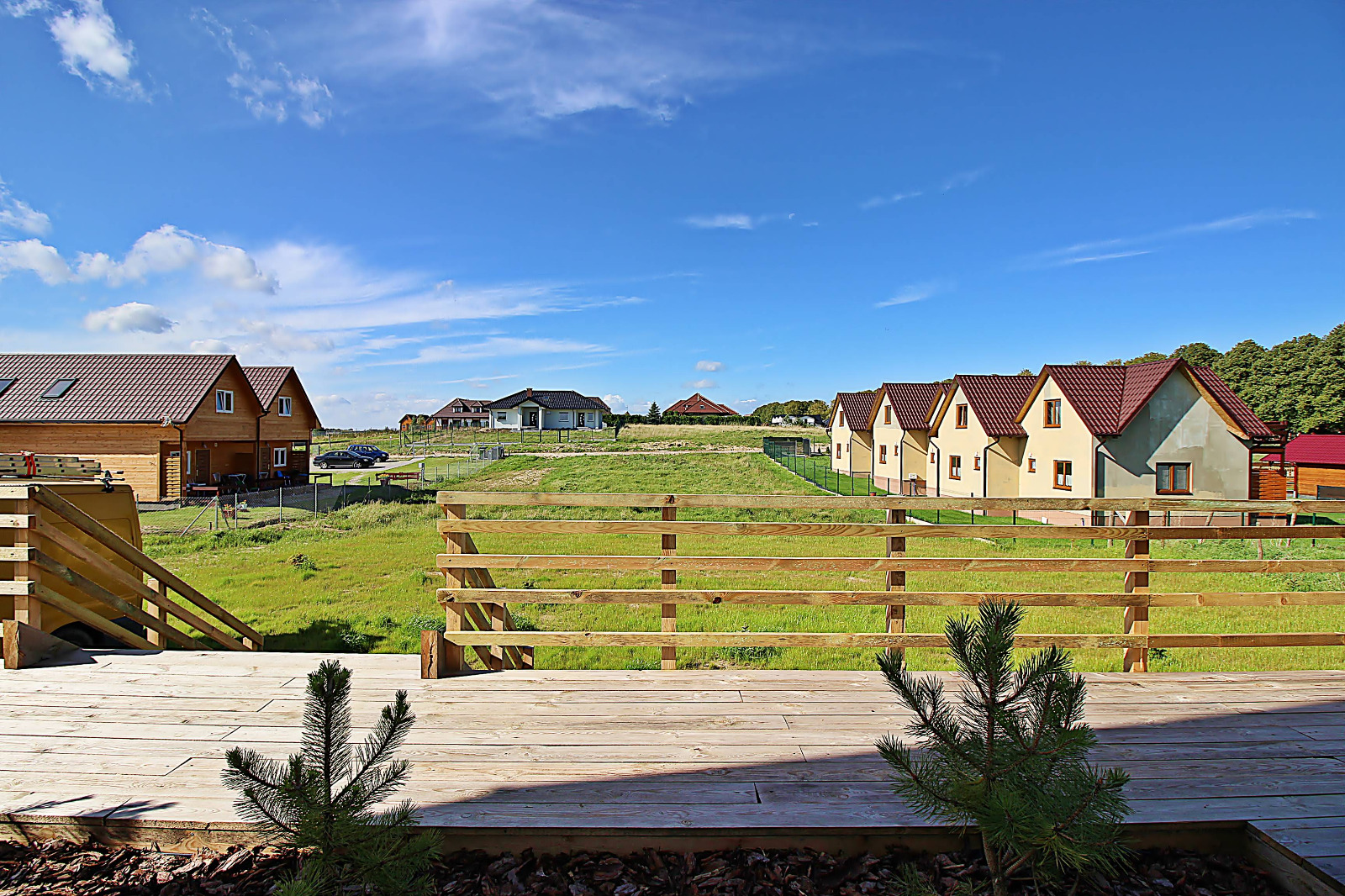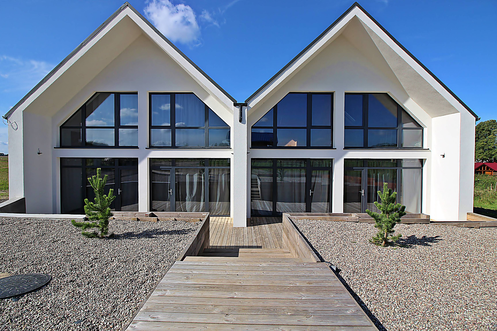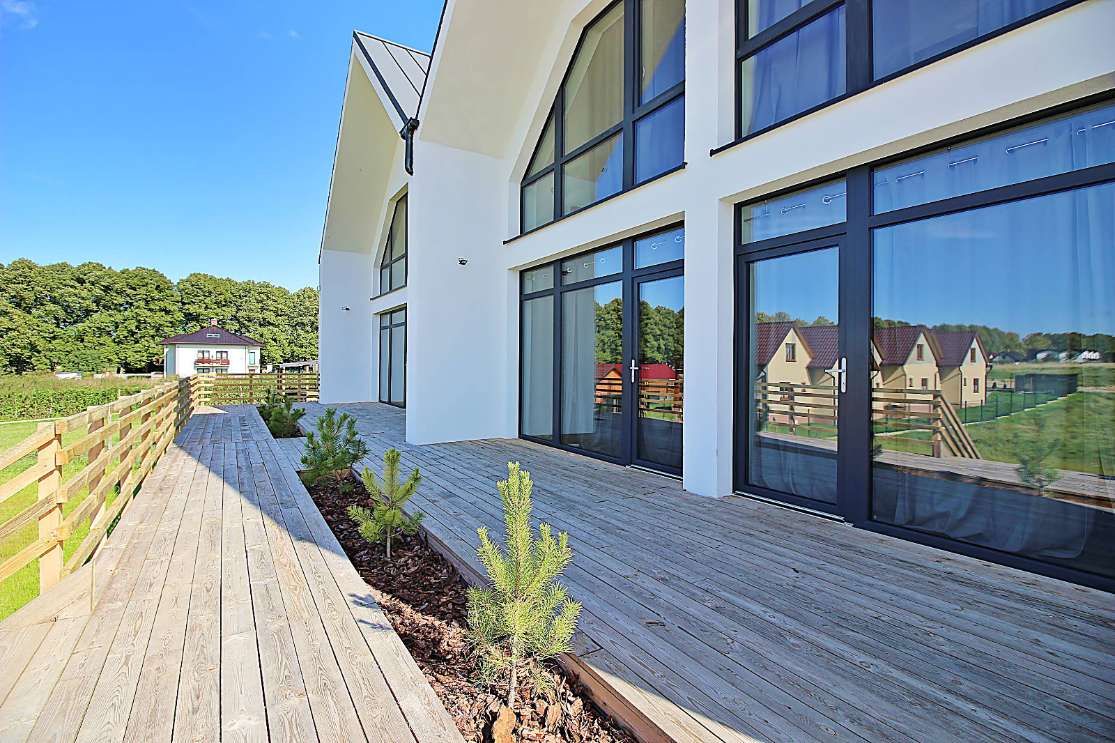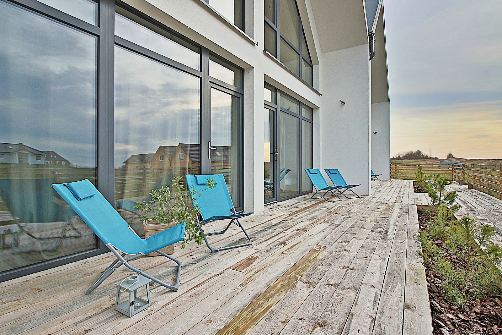 140 m2 – to łączna powierzchnia drewnianych tarasów przylegających do budynku.